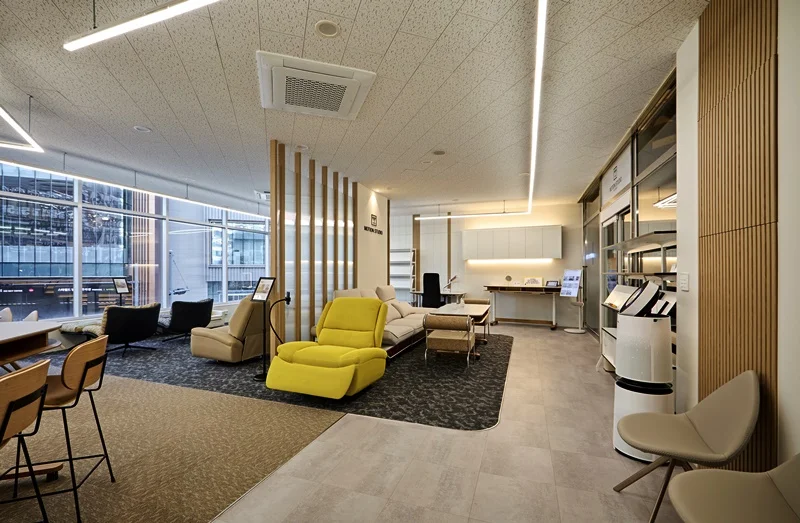 전체적으로 완성된 쇼룸은 고급스럽고 편안한 분위기를 바탕으로 브랜드의 아이덴티티를 효과적으로 표현하고 있으며, 자연광과 조명이 만드는 공간의 깊이감, 편안한 좌석 구성, 감각적인 디스플레이가 조화를 이루는 고급 전시공간으로 완성되었습니다.