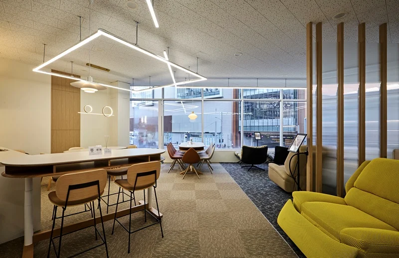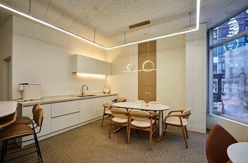 천장과 벽면에는 직선과 곡선이 조화된 모던한 LED 라인 조명이 설치되어 공간에 입체감과 리듬감을 부여하며, 자연광도 넉넉히 채워져 밝고 활기찬 분위기를 만들었습니다. 특히 대형 창문을 통해 들어오는 외부 빛이 인테리어와 가구의 질감을 살려주어 시각적인 개방감을 극대화합니다.