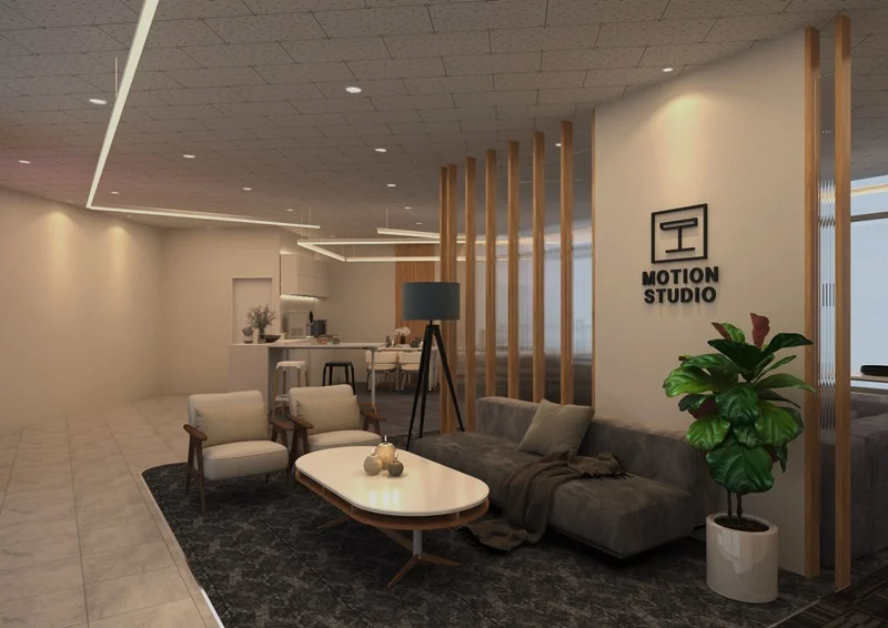 좌석 구성은 3D 단계에서 가장 세밀하게 조정한 부분입니다. 편안한 좌석 구성을 중심으로, 곡선 소파·라운지 체어·우드 포인트 의자를 조화롭게 배치하여 쇼룸에 머무르는 시간이 자연스럽게 길어지도록 설계했습니다. 고객이 실제 사용감을 체험하는 것처럼 느끼게 하는 것이 이번 가구쇼룸인테리어의 핵심 중 하나였기 때문입니다. 또한 3D디자인에서는 파티션과 목재 슬랫 구조물을 통해 공간을 완전히 분리하지 않고도 영역을 구분하는 디자인을 적용했습니다. 이를 통해 쇼룸에 개방감을 유지하면서도 브랜드 가치가 담긴 고급 전시공간 브랜딩이 가능하도록 방향성을 확립했습니다.