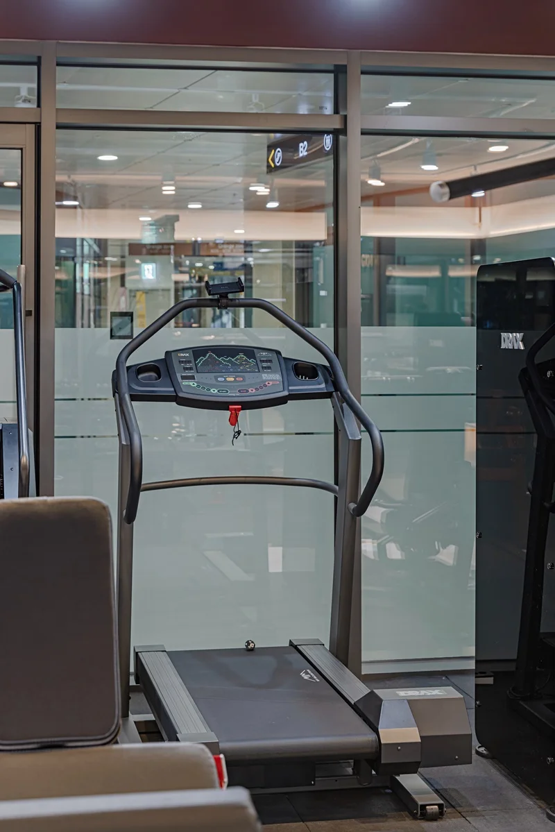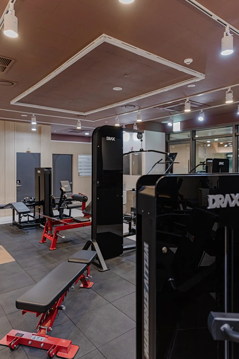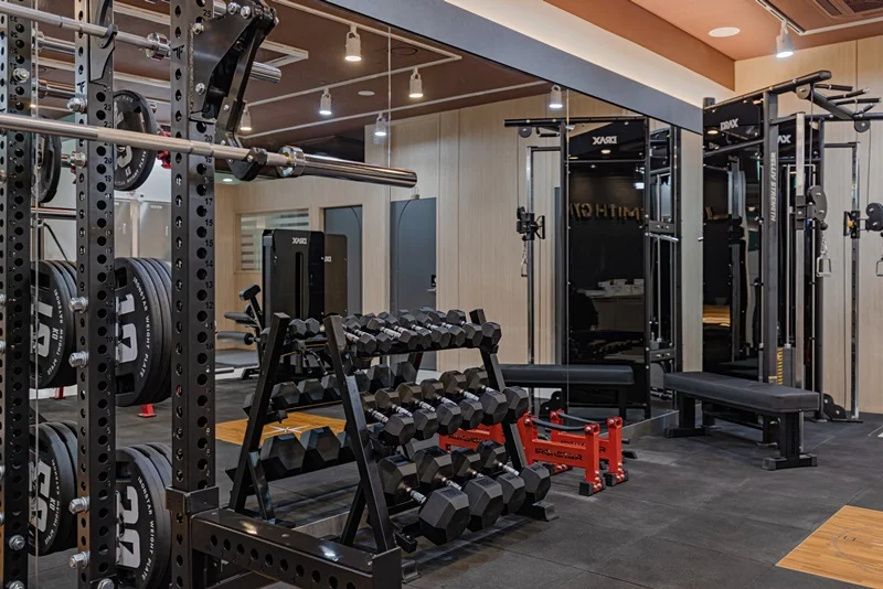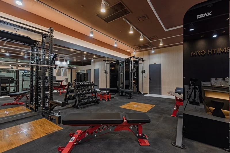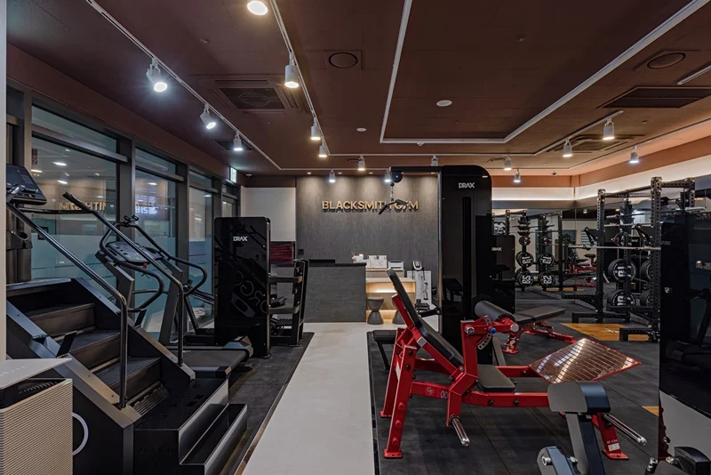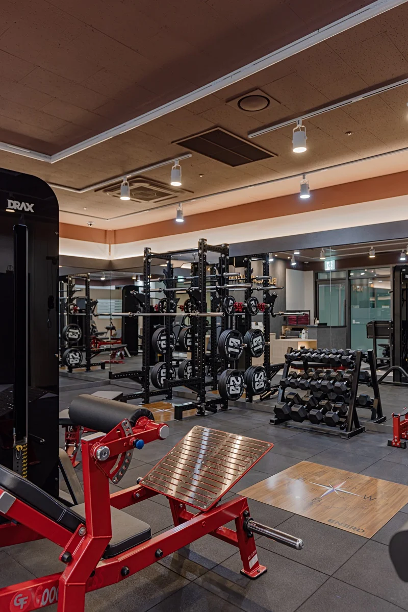 헬스장 메인 공간은 다크 그레이 톤 바닥재와 노출 천장으로 무게감 있는 분위기를 조성했습니다.