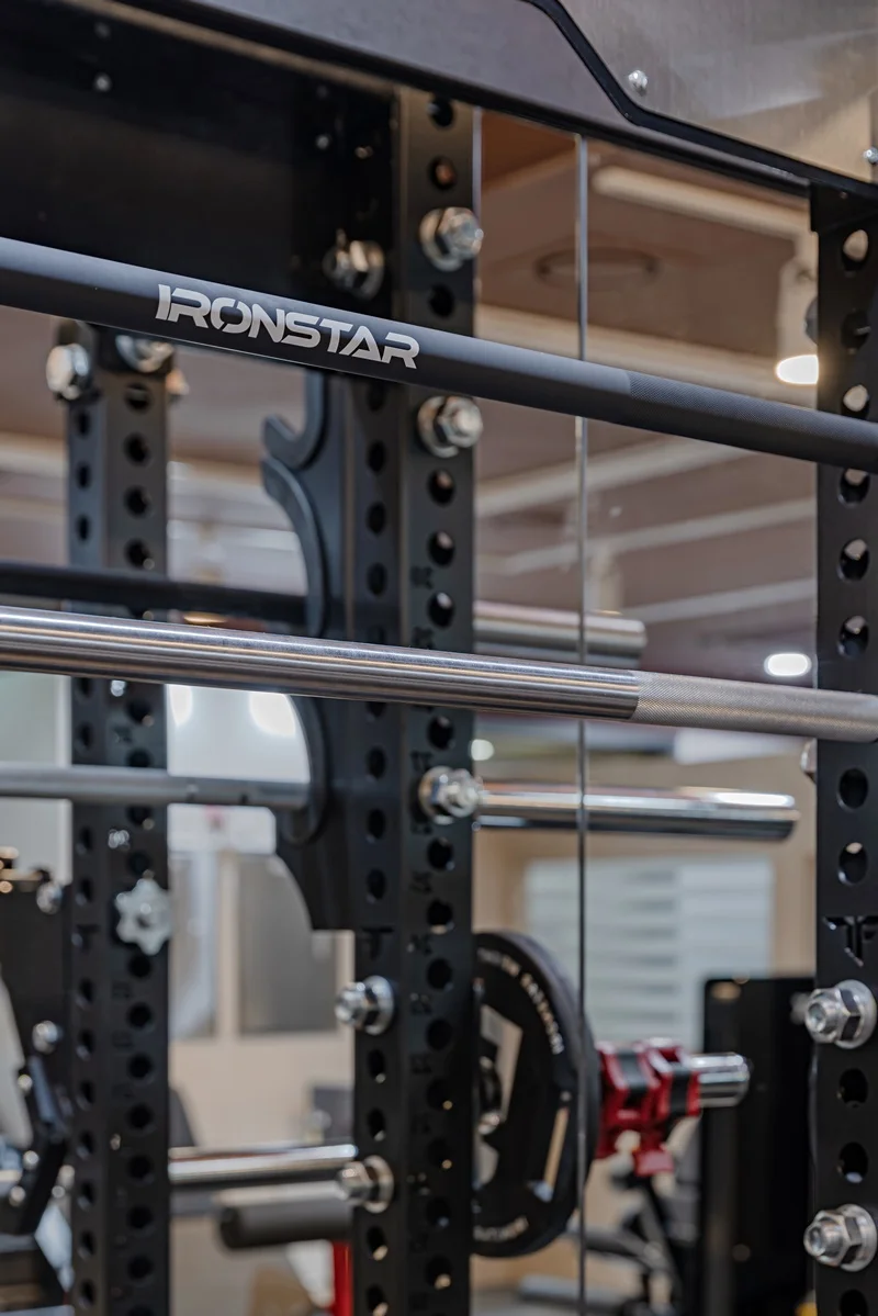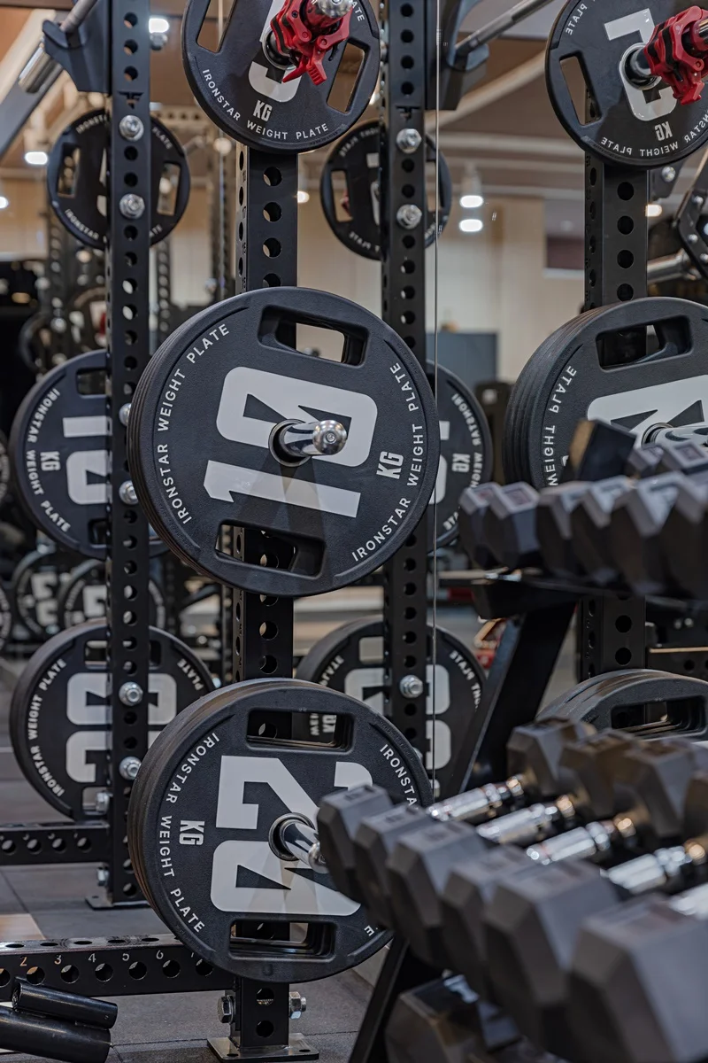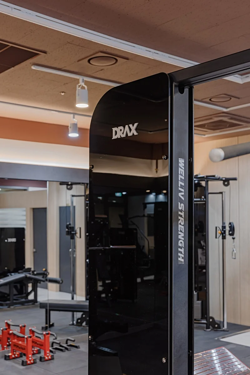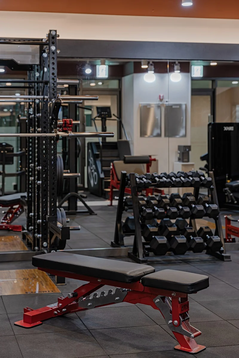 헬스장 메인 공간은 다크 그레이 톤 바닥재와 노출 천장으로 무게감 있는 분위기를 조성했습니다.