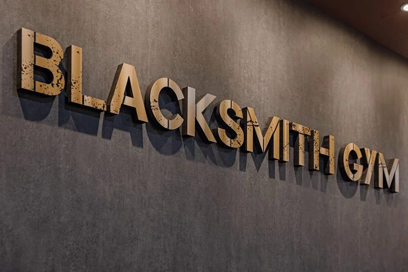 헬스장은 특히 간판과 사인물이 중요하기에 선명하게 보이도록 골드 로고 사인물을 설치해 고객의 이목을 집중시키도록 디자인했습니다.