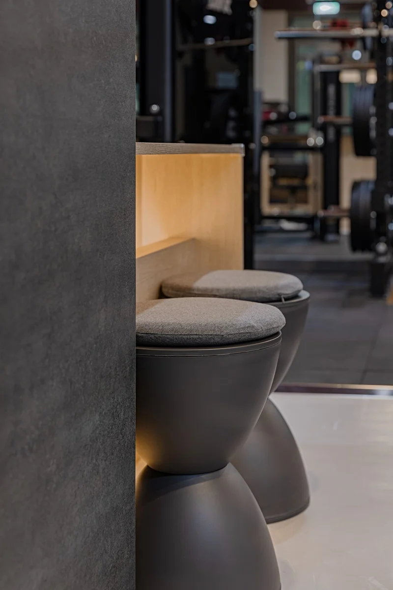 우드 소재의 테이블과 체어를 배치하고, 테이블 하단에는 조명으로 은은한 분위기를 연출하며, 운동 프로그램 상담이나 회원권 상담이 자연스럽게 이루어지도록 했습니다.