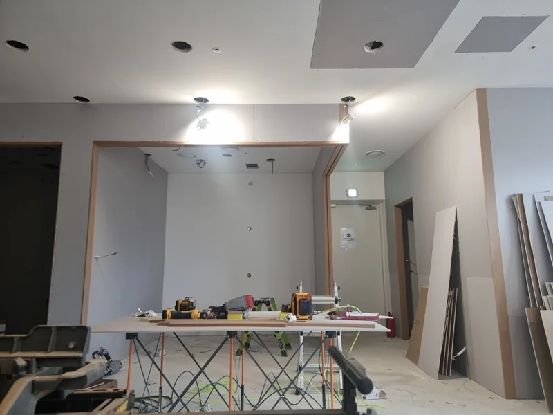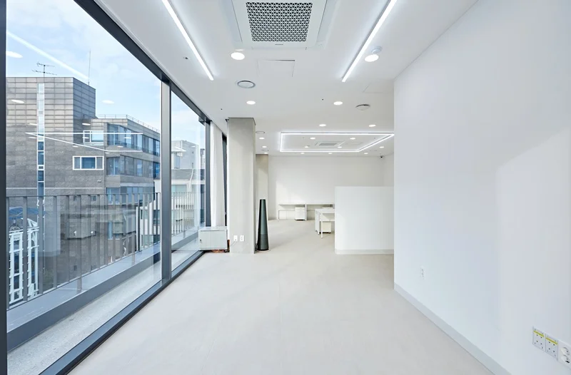 이후 벽면, 바닥, 천장 마감 작업이 이어집니다. 벽면은 화이트 톤으로 페인트 마감을 하면서 일부 포인트 벽에는 기업의 브랜드 컬러를 적용해 전체 공간과 조화를 이루도록 하였고, 원목 바닥을 시공하여 따뜻함과 안정감을 더했습니다. 천장에는 매립형 LED 조명을 설치하고 간접조명을 적절히 배치하여 공간의 밝기와 분위기를 균형 있게 조절했습니다