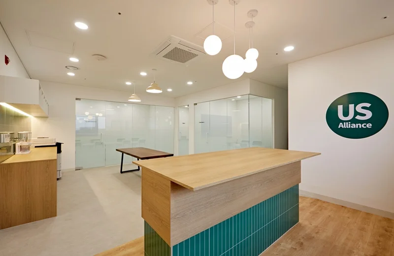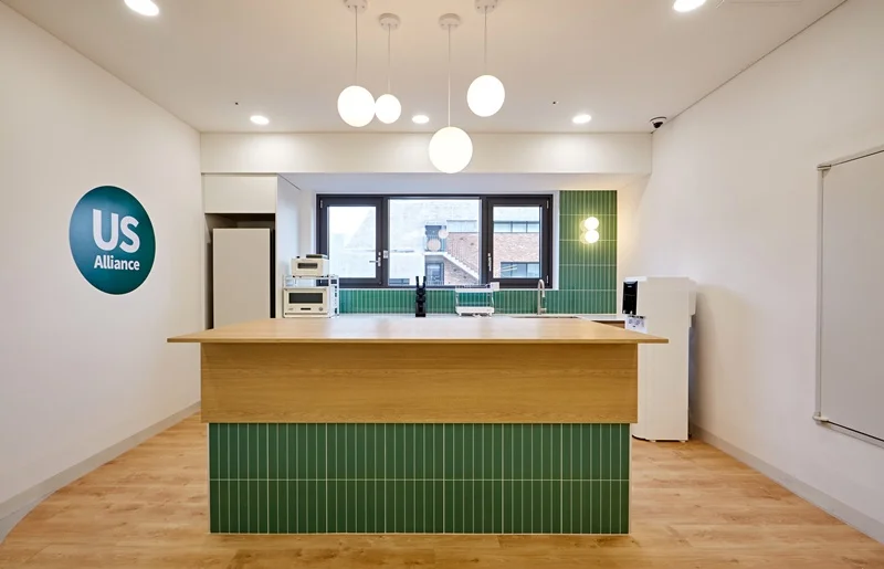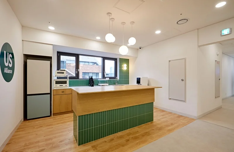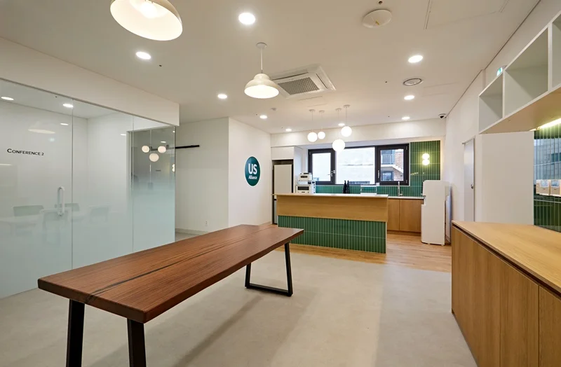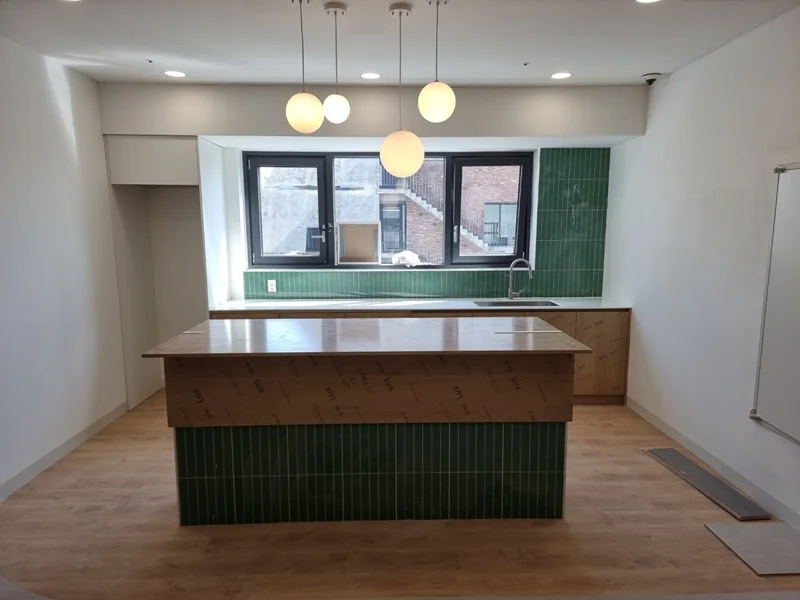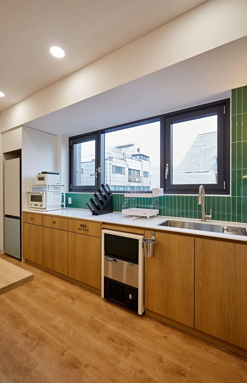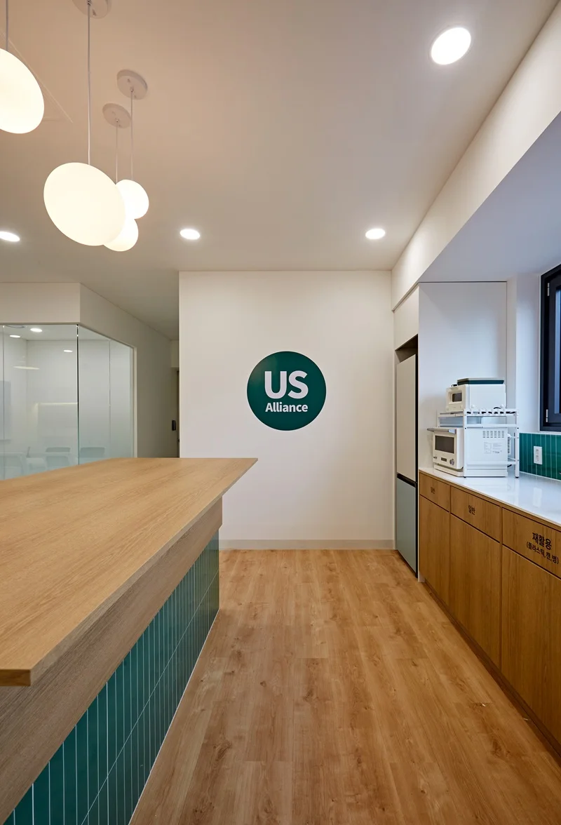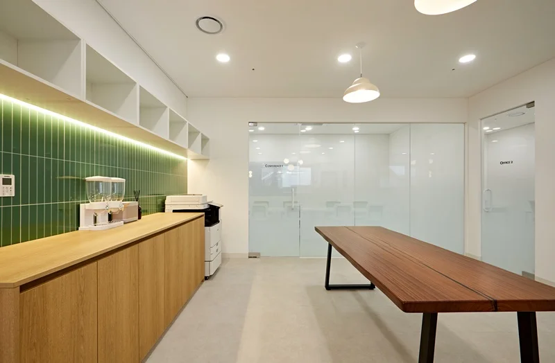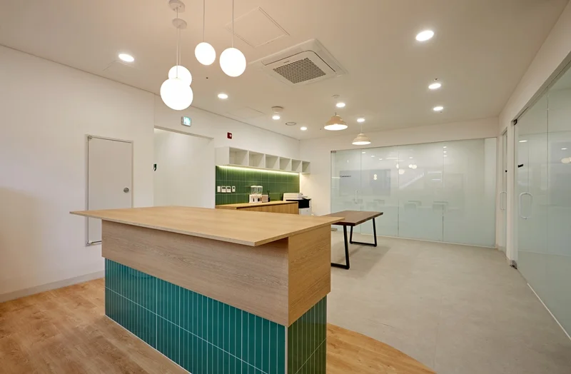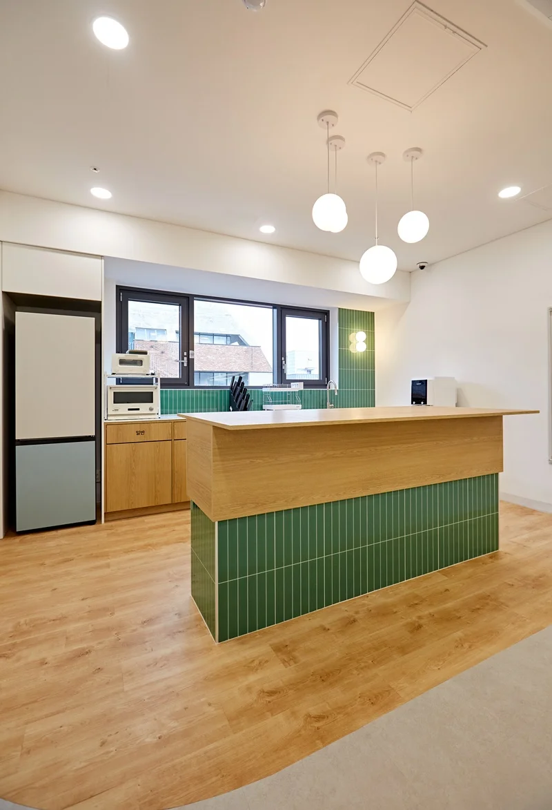 원목에 그린 타일 포인트의 아일랜드 장과 원목 바닥의 조화는 전체 사무실 디자인과 통일성을 이루면서도, 공간에 활기를 불어넣습니다. 카페테리아 벽면에는 소규모 선반과 조명을 배치해 소품을 활용할 수 있도록 설계했으며, 자연광이 들어오는 창가에는 싱크대 하부장만 배치하여 공간의 개방감을 극대화하였습니다.