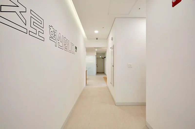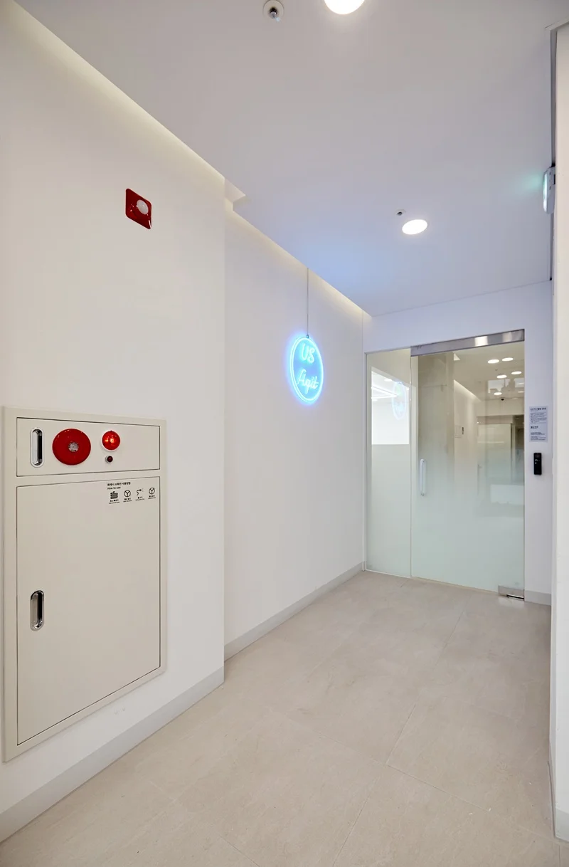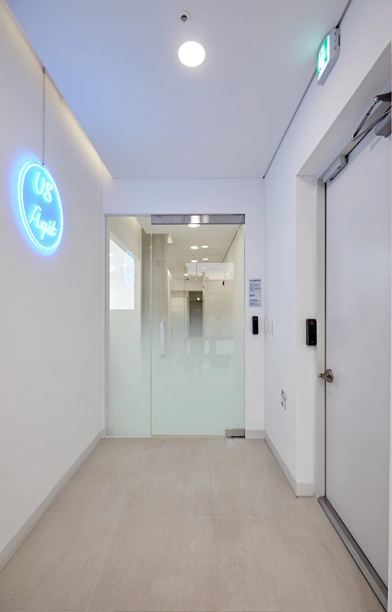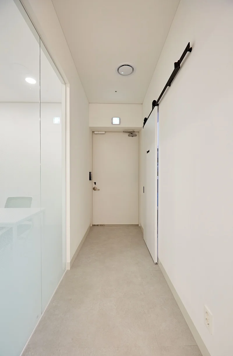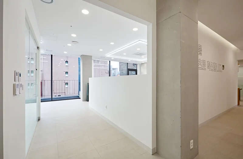 사무실의 첫인상을 결정짓는 입구 파사드는 이번 프로젝트에서 가장 주목할 만한 공간입니다. 전체적으로 심플한 화이트 톤을 기반으로, 레온사인 원형 조명을 활용해 기업명을 부각시켰습니다. 입구 전면에는 매끄러운 화이트 벽면을 적용하고, 레온사인을 중앙에 배치해 고급스러우면서도 모던한 느낌을 강조했습니다.