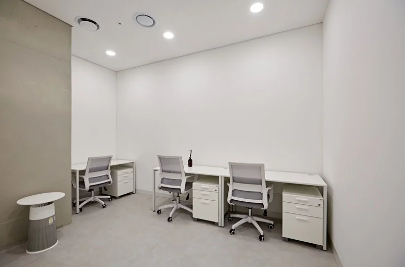 사무실의 핵심 공간인 오픈형 사무공간은 화이트 컬러의 책상과 모던한 의자를 활용해 심플함을 유지하면서도 효율적인 업무 환경을 조성했습니다. 각 책상은 직원 개인 공간을 확보하면서도 협업이 용이하도록 배치했습니다. 화이트 책상과 바닥톤의 조화는 시각적으로 깔끔하면서도 따뜻한 분위기를 만들어주며, 공간의 개방감을 극대화합니다.