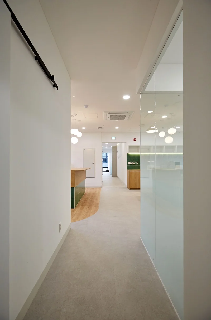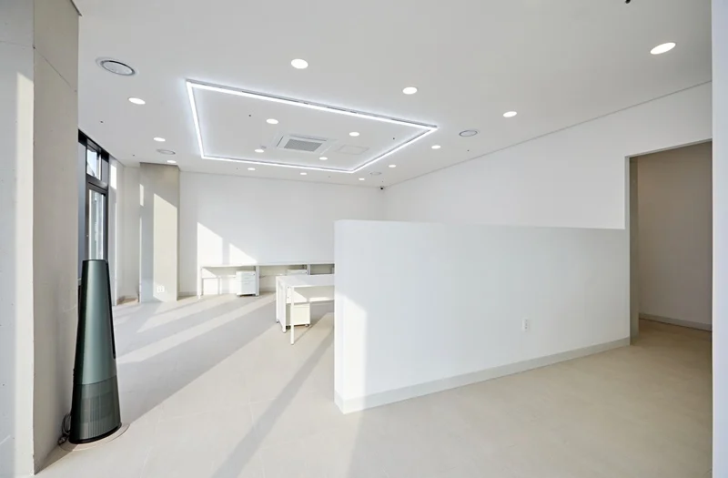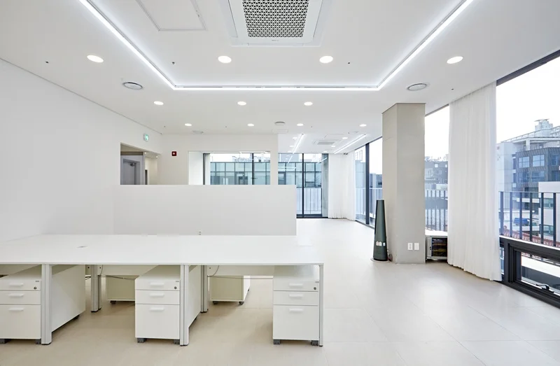 조명 또한 은은한 간접조명을 활용해 눈의 피로를 최소화하면서, 전체 공간이 더욱 넓고 시원해 보이도록 계획했습니다. 심플한 디자인은 시각적 잡음을 줄여 집중력을 높이는 효과가 있으며, 회의실과 오픈형 사무공간으로 자연스럽게 시선이 이어지도록 설계되었습니다. 바닥도 화이트 톤으로 깨끗하고 통일감있게 마감하였습니다.