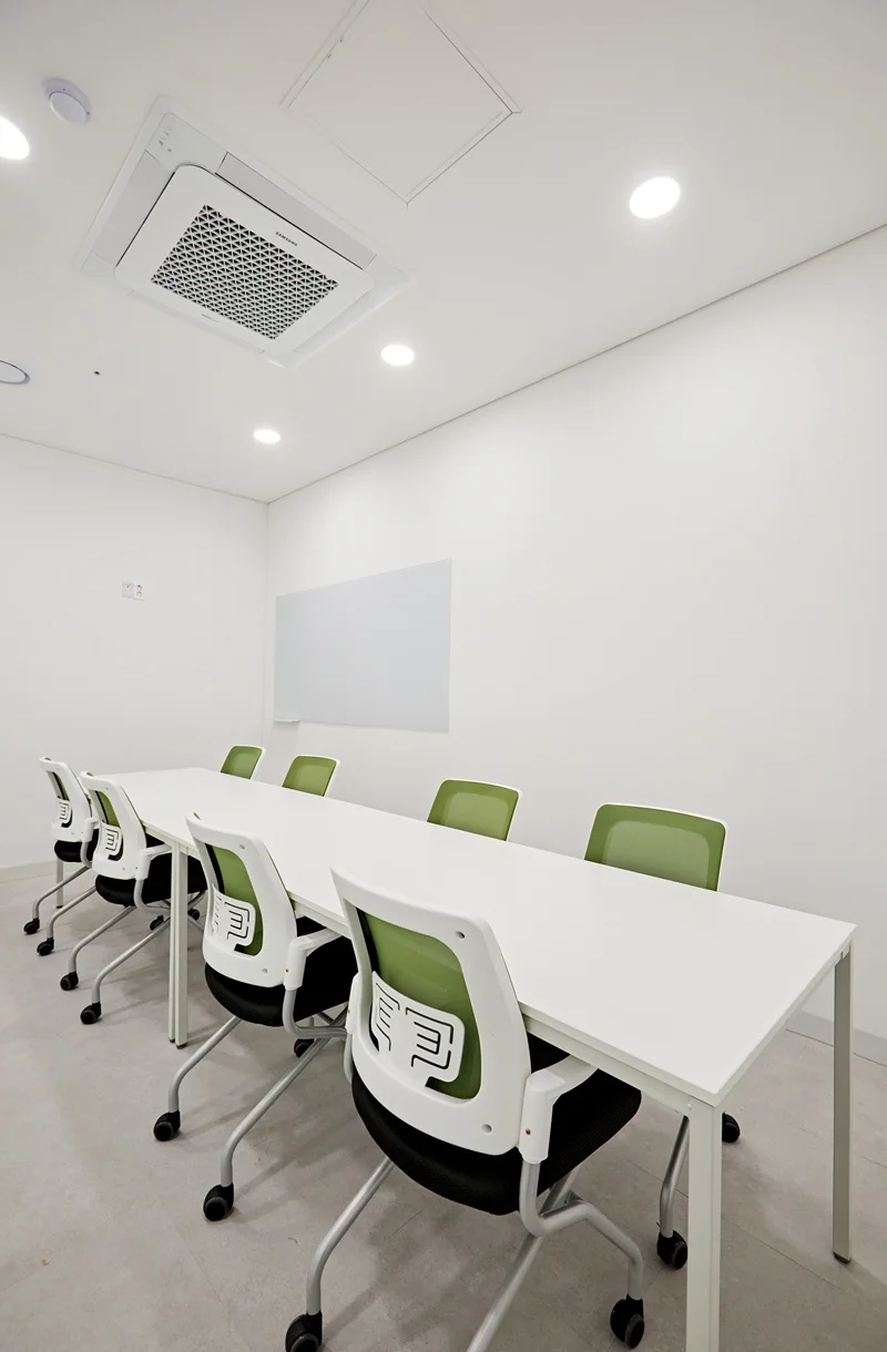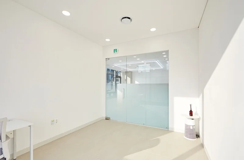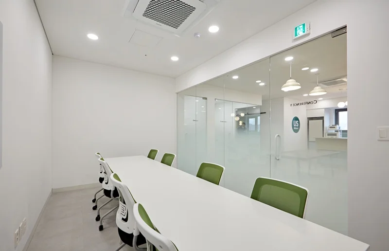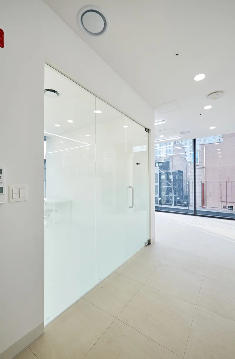 회의실은 유리가벽으로 설계하여 시각적 개방감을 확보했습니다. 유리 가벽은 공간을 분리하면서도 투명성을 통해 전체 사무실과 자연스럽게 연결되도록 했습니다. 유리에는 은은한 불투명 필름을 적용해 내부 프라이버시를 보호하면서도 개방감을 유지했습니다. 회의실 내부는 회의용 테이블과 의자를 배치하여 편안한 회의 환경을 제공합니다. 유리가벽 회의공간은 직원과 방문객 모두에게 시각적 만족감과 기능성을 동시에 제공합니다.