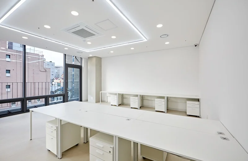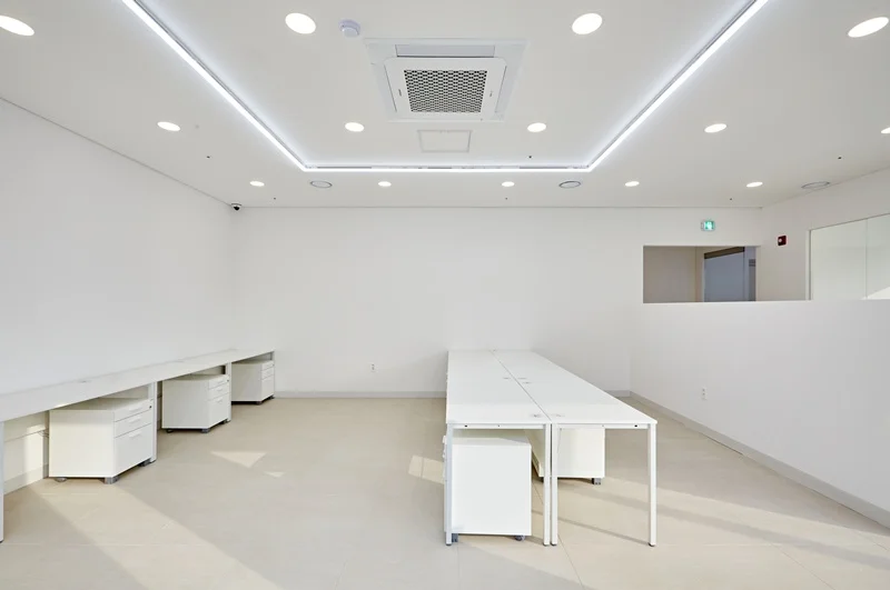 조명은 전체적으로 균일하게 배치하여 눈부심이나 그림자를 최소화했습니다. 천장 매립형 LED 조명을 활용해 책상마다 고르게 빛이 닿도록 설계했고, 자연광과 조화를 이루어 장시간 근무에도 피로감을 줄이는 환경을 만들었습니다.