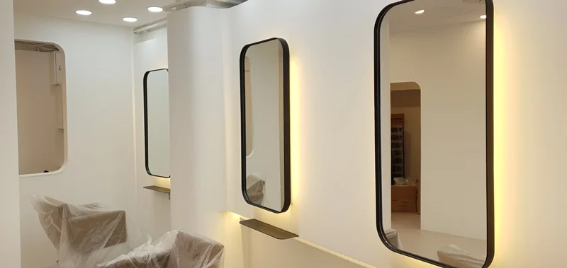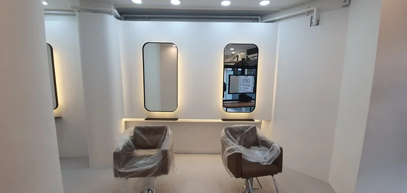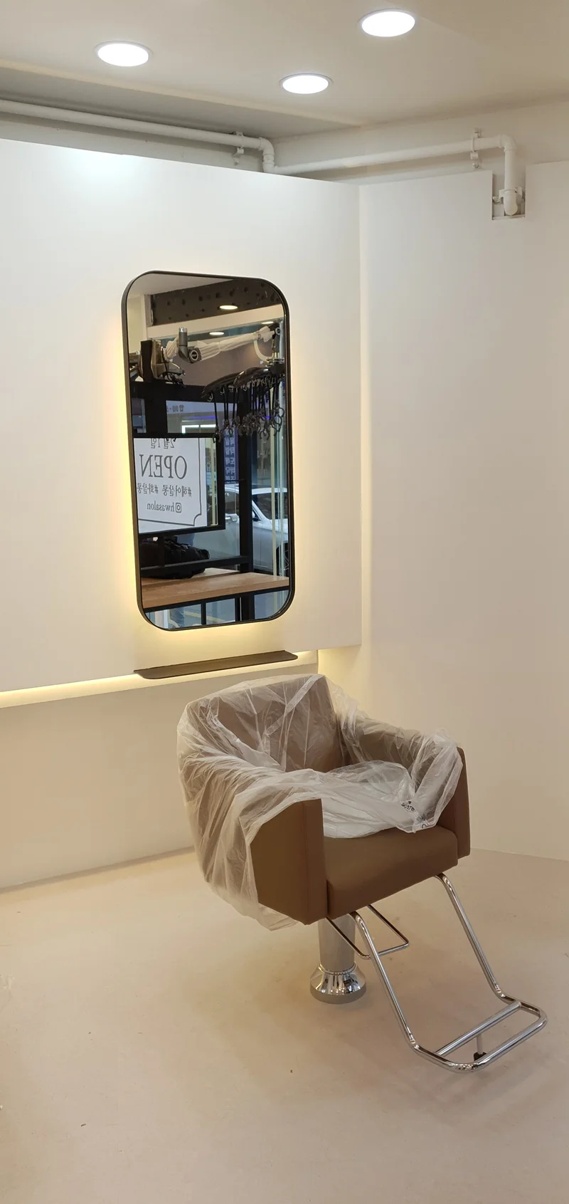 천장에는 매립형 LED 조명과 원형 매입등을 조화롭게 배치하여 그림자 없이 고르게 빛이 퍼지도록 설계했고, 벽면의 조명은 간접조명 방식으로 거울 주변에 포인트를 주어 고객이 더 밝고 따뜻한 느낌을 받을 수 있도록 했습니다. 특히, 전체 공간이 복잡하거나 산만하지 않고 미니멀한 구성으로 마감되어, 도심 속 프라이빗한 헤어 케어 공간이라는 느낌을 전달합니다.
