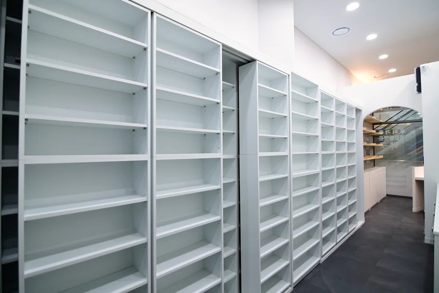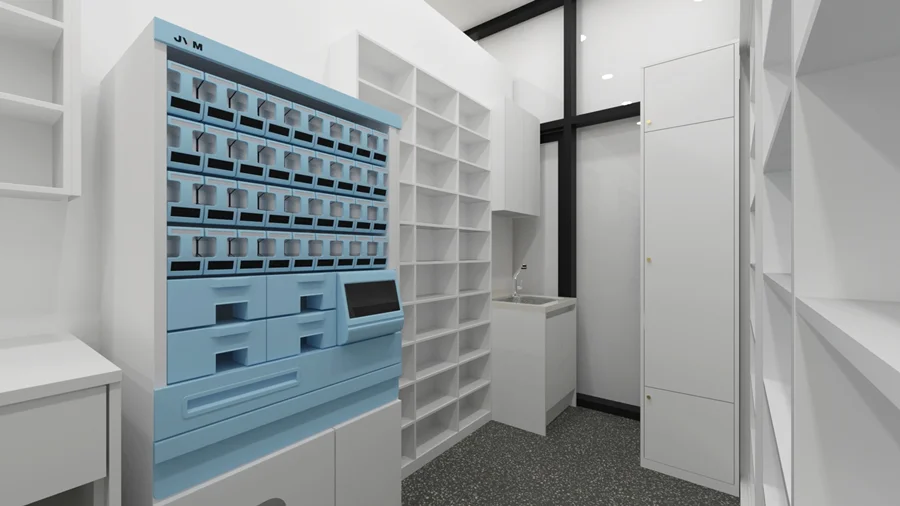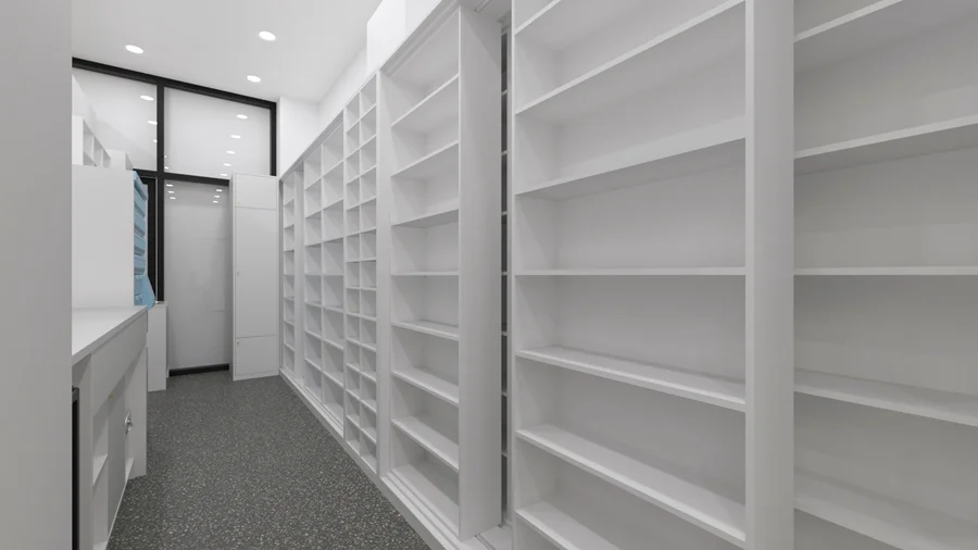 수납공간의 확보: 약국에서는 다양한 종류의 의약품과 물품을 보관해야 하기 때문에 충분한 수납공간이 필요합니다. 벽면을 활용하여 선반을 설치하거나, 천장에 행잉 스토리지를 설치하는 등의 방법을 고려할 수 있습니다. 또 바퀴가 달린 이동식 카트를 활용하여 공간을 효율적으로 활용할 수도 있습니다.
