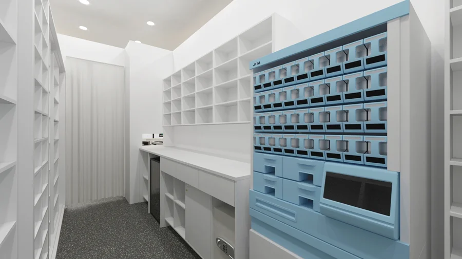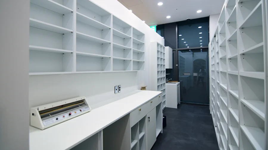 창고는 약국에서 사용하는 의약품과 비품 등을 보관하는 공간으로, 공간 활용을 효율적으로 하기 위해 수납공간을 충분히 확보해야 합니다. 또 환기 시설을 설치하여 쾌적한 환경을 유지해야 합니다.