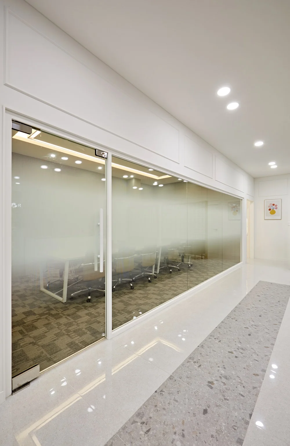 보통 벽이나 칸막이로 공간을 나누면 굉장히 답답한 느낌이 들지만, 곡선 유리가벽은 시각적으로 트인 감각을 유지해줘요. 또 다른 방을 추가로 만들어 일할 수 있는 공간을 만들 수도 있어요. 기능적으로도 그룹 회의에서 개인 업무에 이르기까지 다양한 형태의 작업을 지원할 수 있는 대안이 돼요.