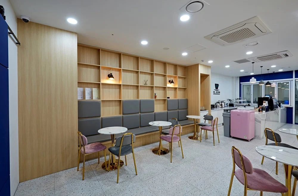 공사가 완료된 현장은 세련된 카페에 온 듯한 착각을 불러일으킬 정도로 완벽한 스터디카페형 디자인을 자랑합니다. 가장 먼저 시선을 사로잡는 곳은 공용 라운지와 카페테리아 구역입니다. 이곳은 입실자들이 휴식을 취하거나 가벼운 식사를 할 수 있는 커뮤니티 공간으로, 비앙코 패턴의 대리석 테이블과 골드 프레임의 체어를 배치하여 럭셔리한 무드를 자아냅니다.