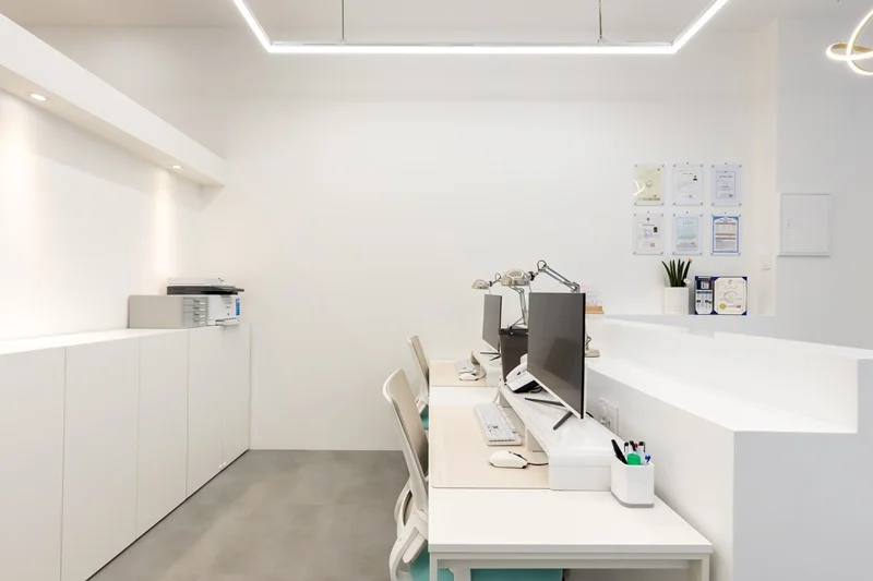리셉션 안쪽에는 책상을 배치하여 직원들이 고객을 응대하면서 동시에 업무 처리가 가능하도록 했습니다. 이를 통해 작은 공간 안에서도 효율적인 동선을 확보하고, 고객과 직원 간의 상호작용을 원활하게 만들었습니다.