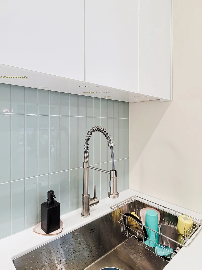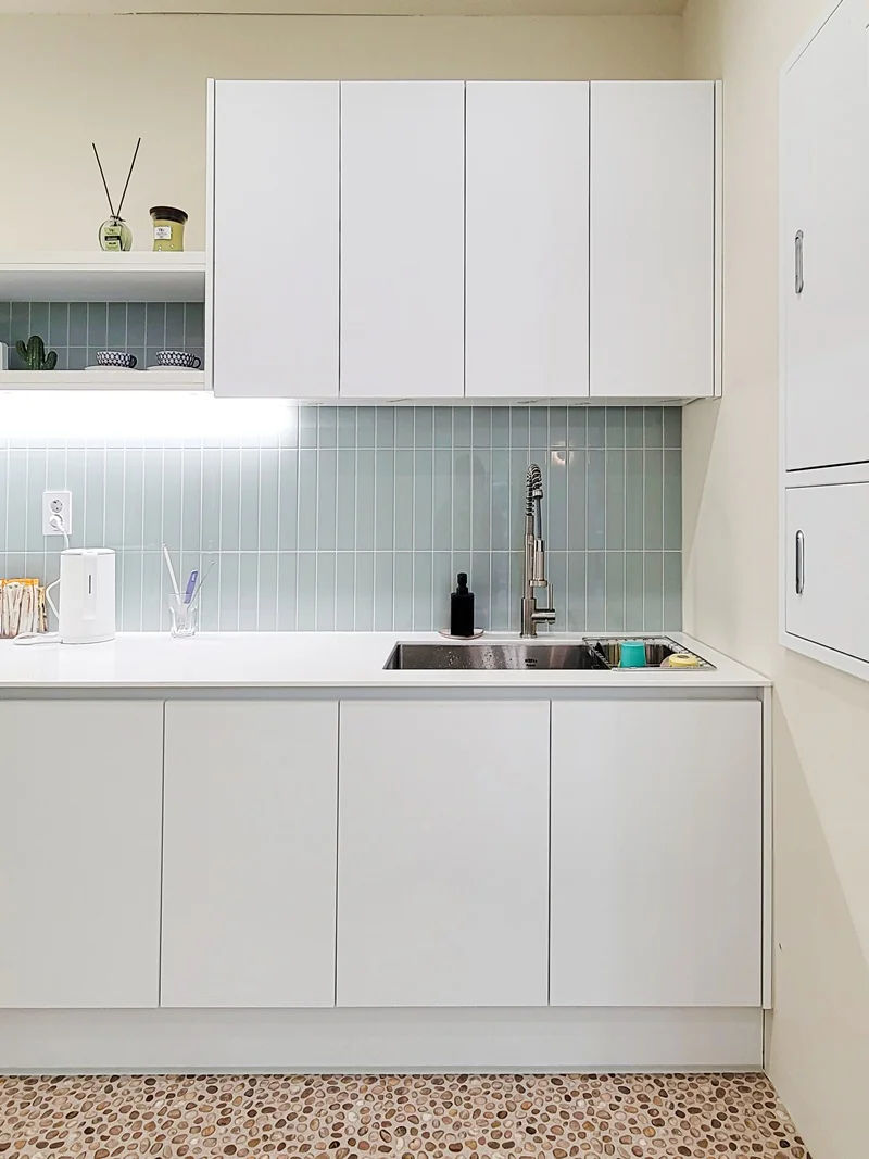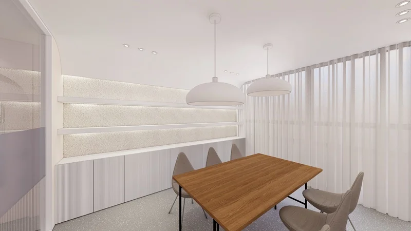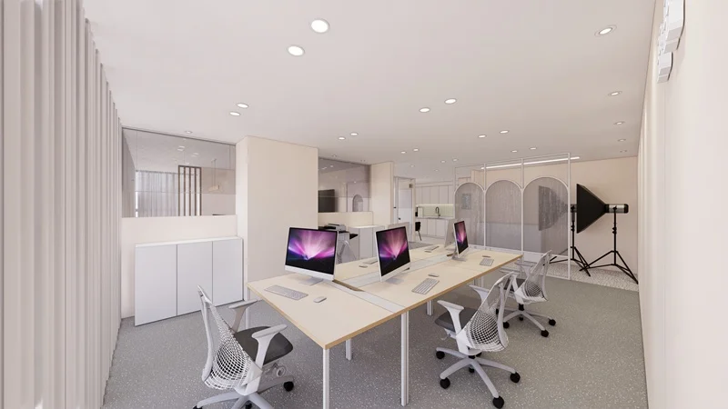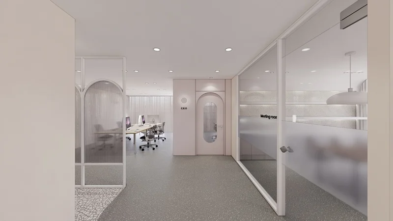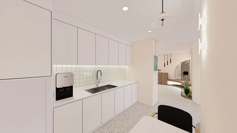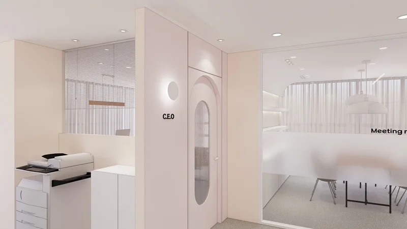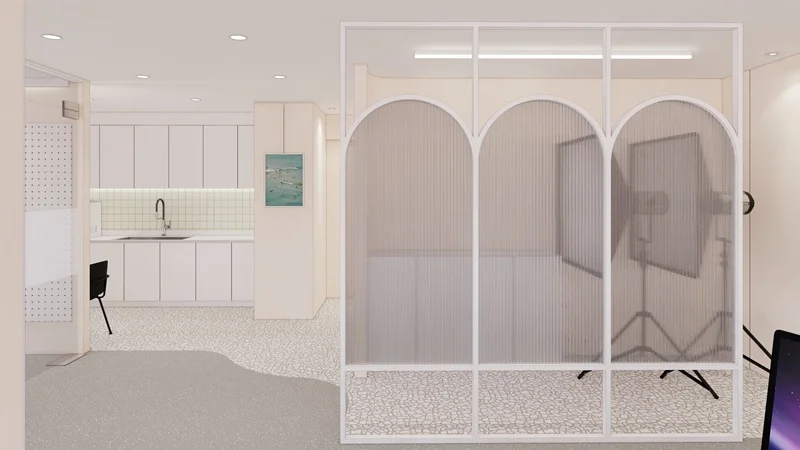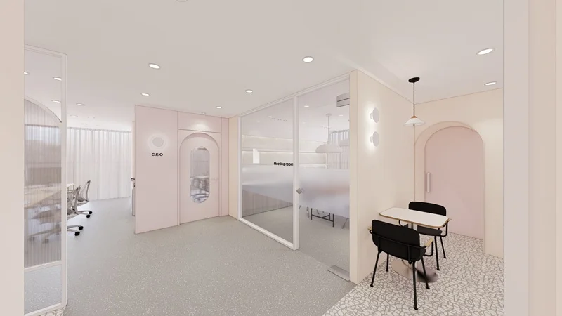소형 사무실 내에서도 작은 휴게 공간은 필수입니다. 이번 공간에서는 카페 분위기를 연출할 수 있는 아치형 곡선 문에 파스텔 색상을 활용해 미니 카페테리아 공간을 마련했습니다. 한쪽 벽면에는 싱크대와 화이트 수납장으로 포인트를 주어 작은 공간이지만 충분히 매력적인 장소로 완성되었습니다. 휴식과 회의, 간단한 티타임까지 다용도로 활용되는 공간입니다.