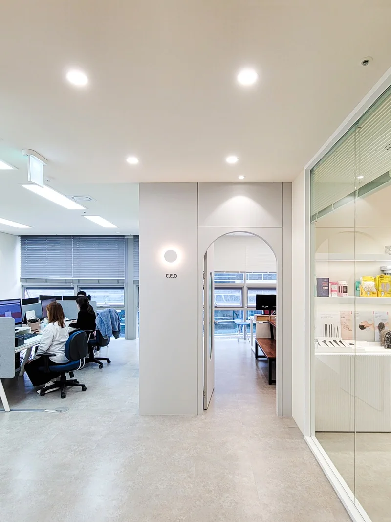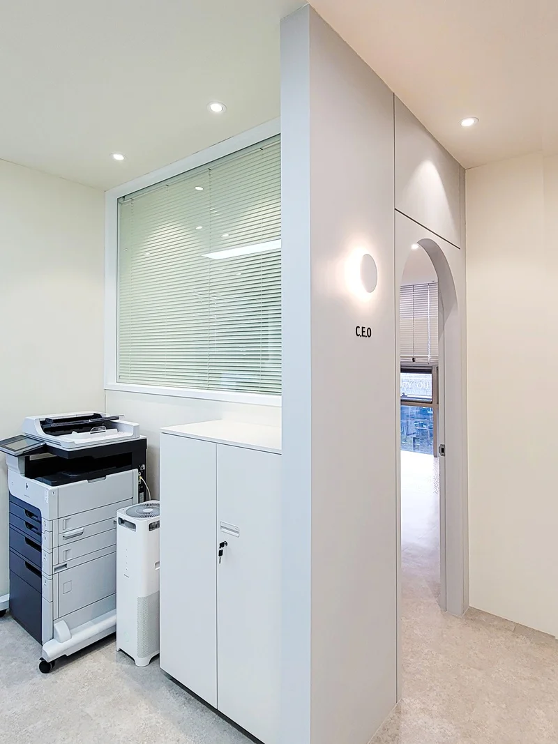 대표실은 소형 사무실에서 차별화된 분위기를 줄 수 있는 공간으로 연출했습니다. 출입구 벽면을 아치형 구조로 설계하여 클래식하면서도 부드러운 이미지를 더하고, 내부는 화이트와 우드의 조화로 차분하면서 안정적인 분위기를 조성했습니다.