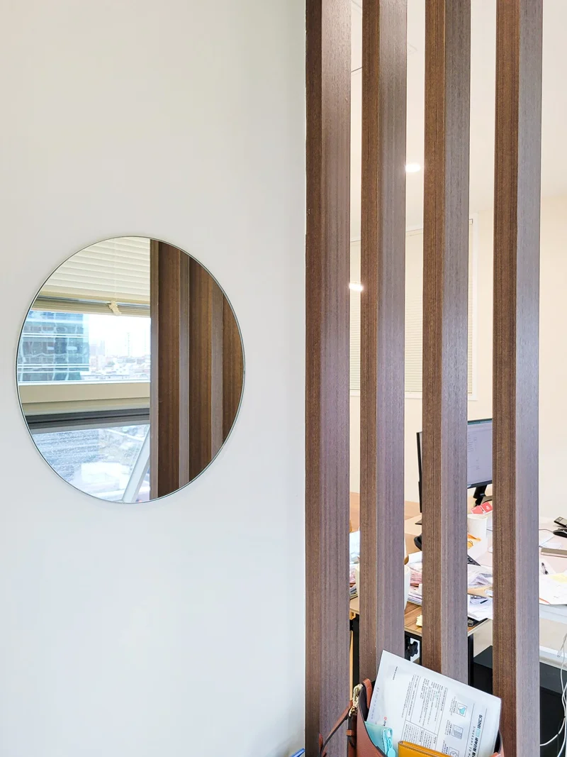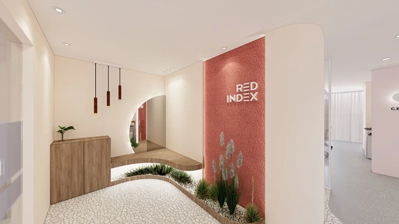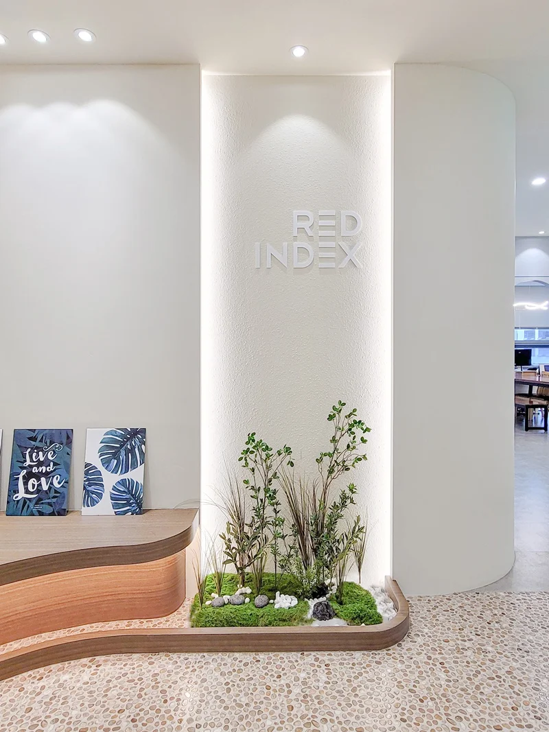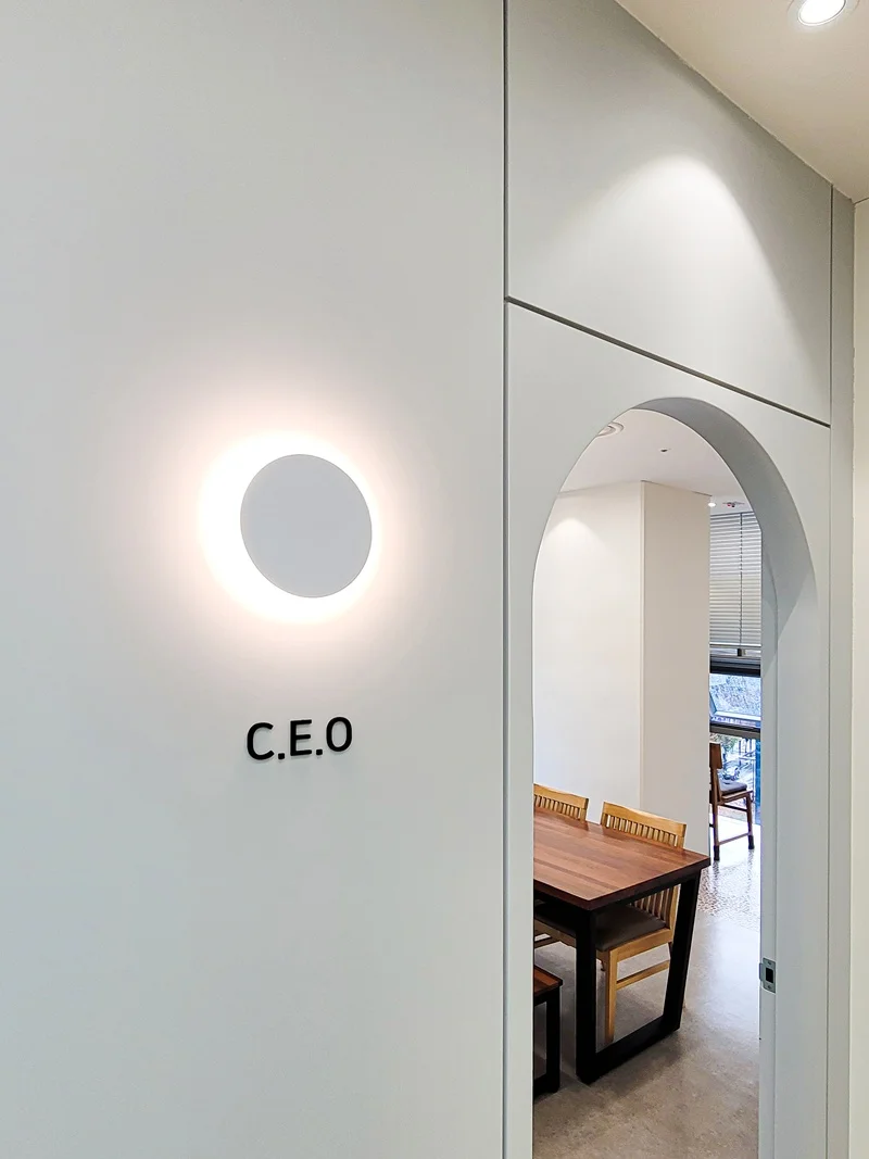곡선 벽면 위쪽에는 입체 사인물을 부착하고, 사인물 뒤로 은은한 조명이 퍼져 나오는 구조로 디자인하여 기업 이미지를 세련되게 표현할 수 있었습니다. 소형 사무실이지만 이처럼 곡선, 식물, 조명을 활용하면 시선을 분산시키고 공간을 더 풍성하게 연출할 수 있습니다.