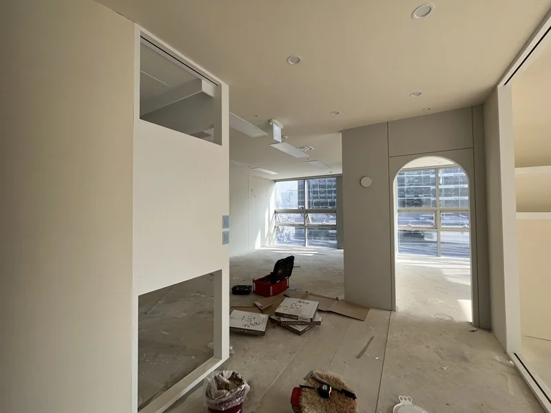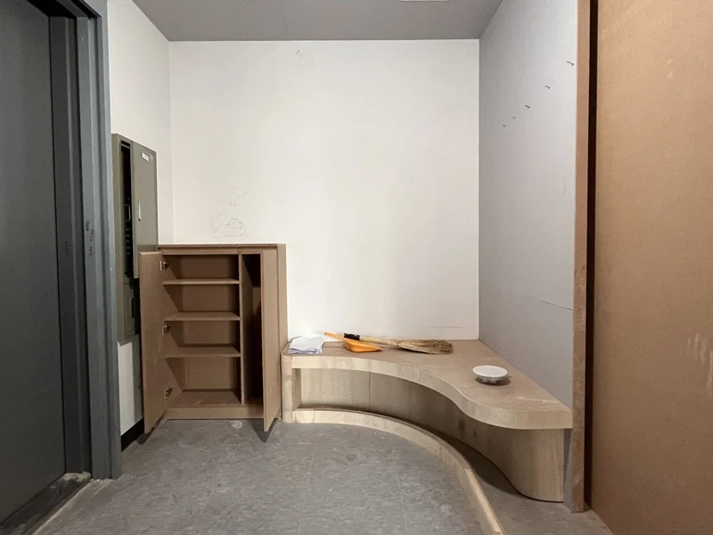 이번 인테리어의 디자인 포인트 중 하나였던 곡선 벽면과 아치형 구조물은 목공 공정에서 섬세한 가공이 요구되는 작업이었습니다. 곡선 아트월은 특수 합판을 사용해 유선형으로 가공하고, 그 위에 조명 배선용 몰딩과 매립 공간을 함께 시공해 차후 간접조명과 플랜테리아 공간이 자연스럽게 어우러지도록 준비했습니다.