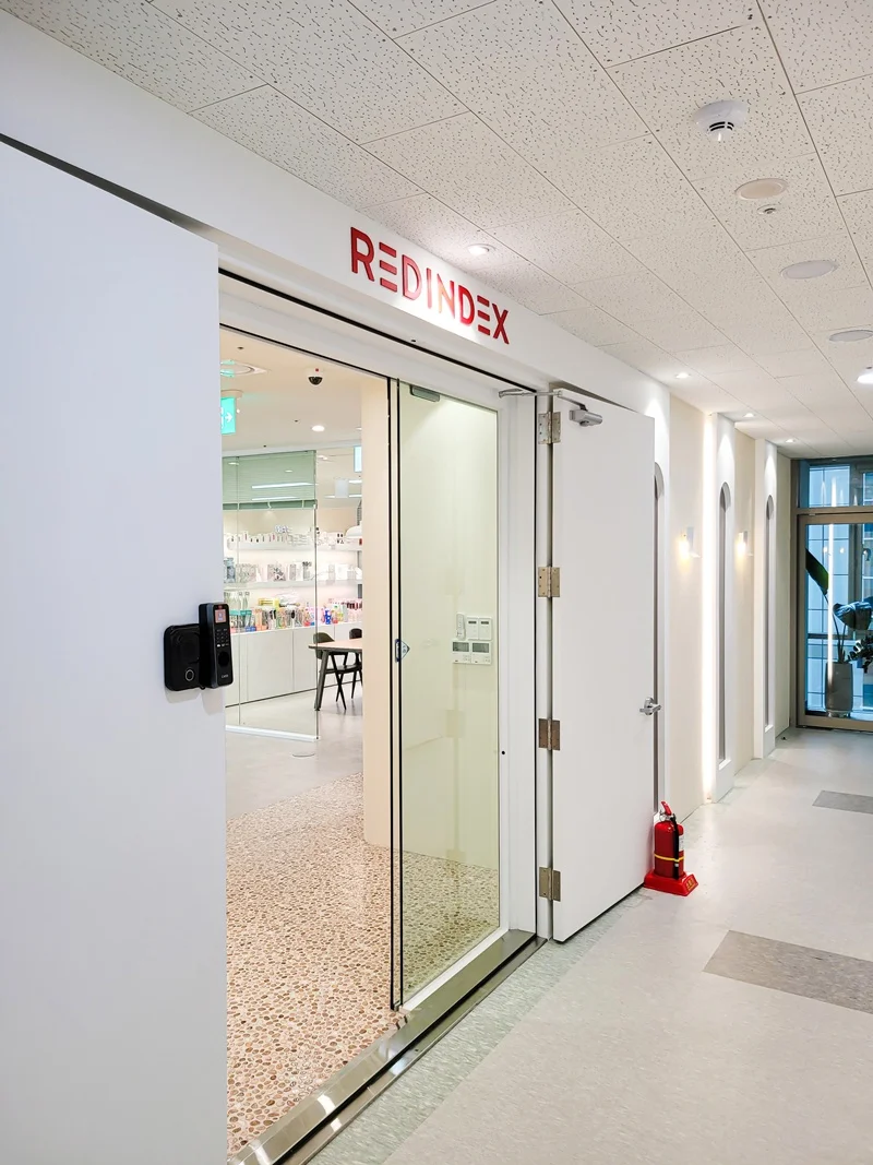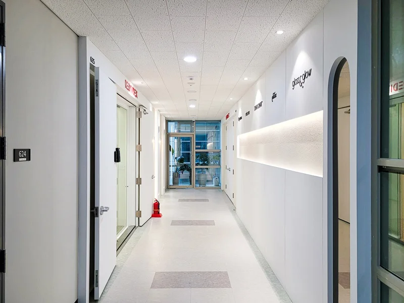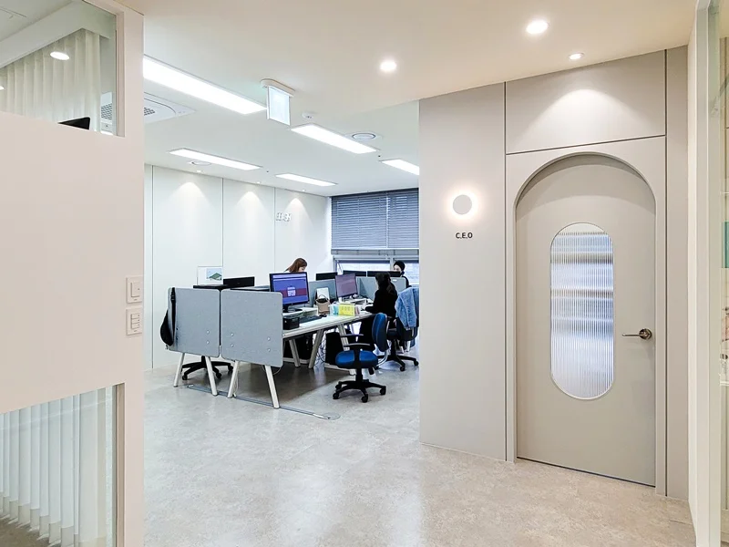 사무실의 첫인상을 결정짓는 입구 파사드는 전체적으로 화이트 컬러의 벽면 마감과 가로형 매립 조명으로 디자인했습니다. 특히 직선으로 길게 뻗은 라인 조명이 시선을 넓게 퍼지게 만들어 공간의 확장감을 극대화하는 효과를 주며, 작은 입구 공간도 넓고 깊어 보이는 시각적 연출이 가능합니다.