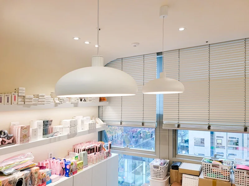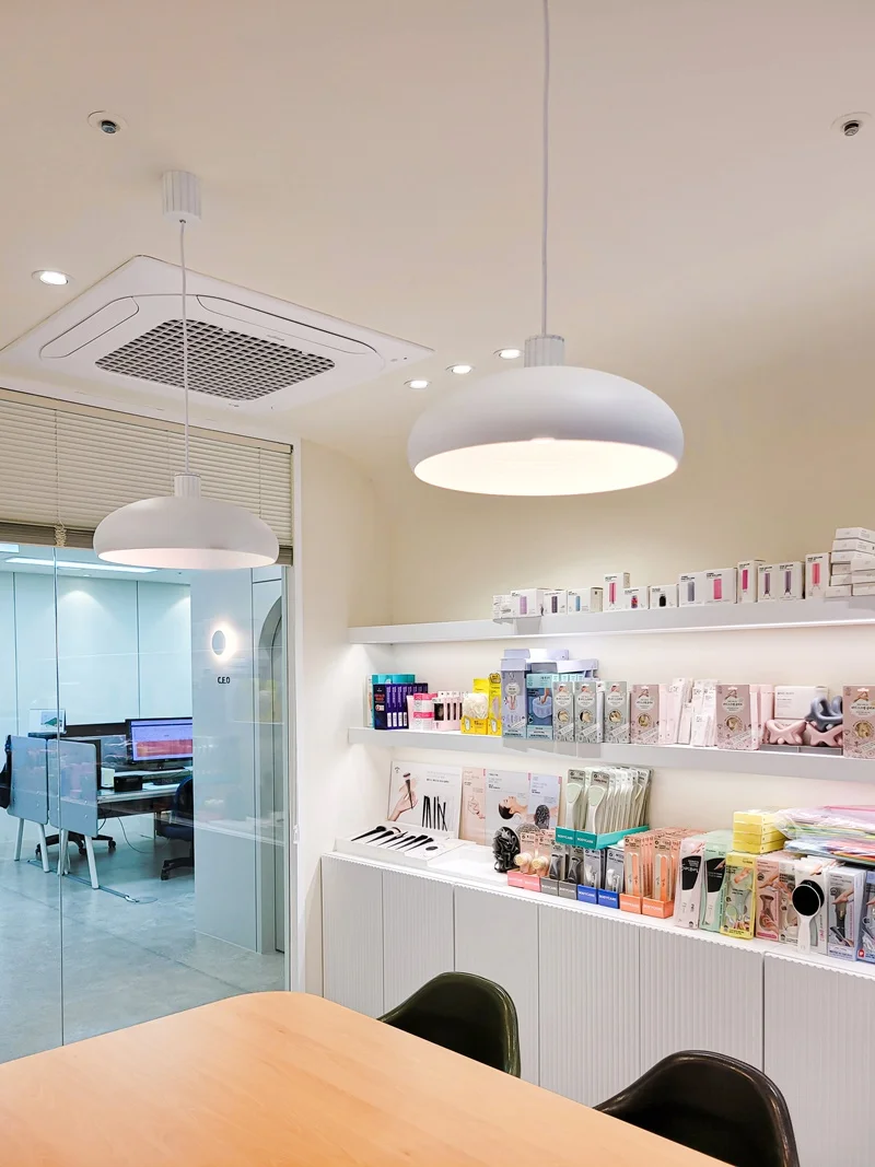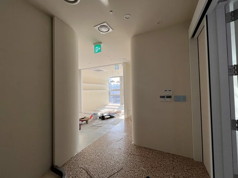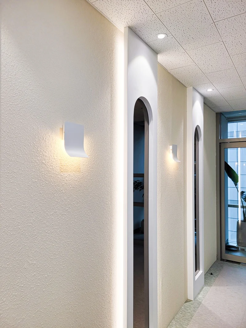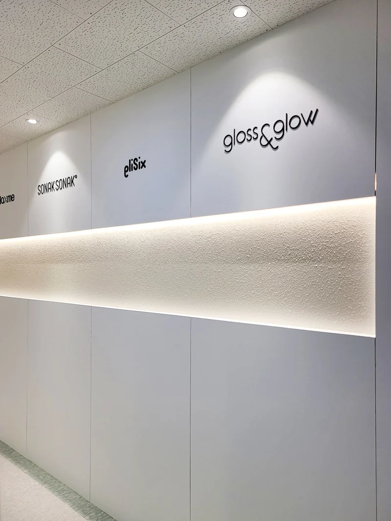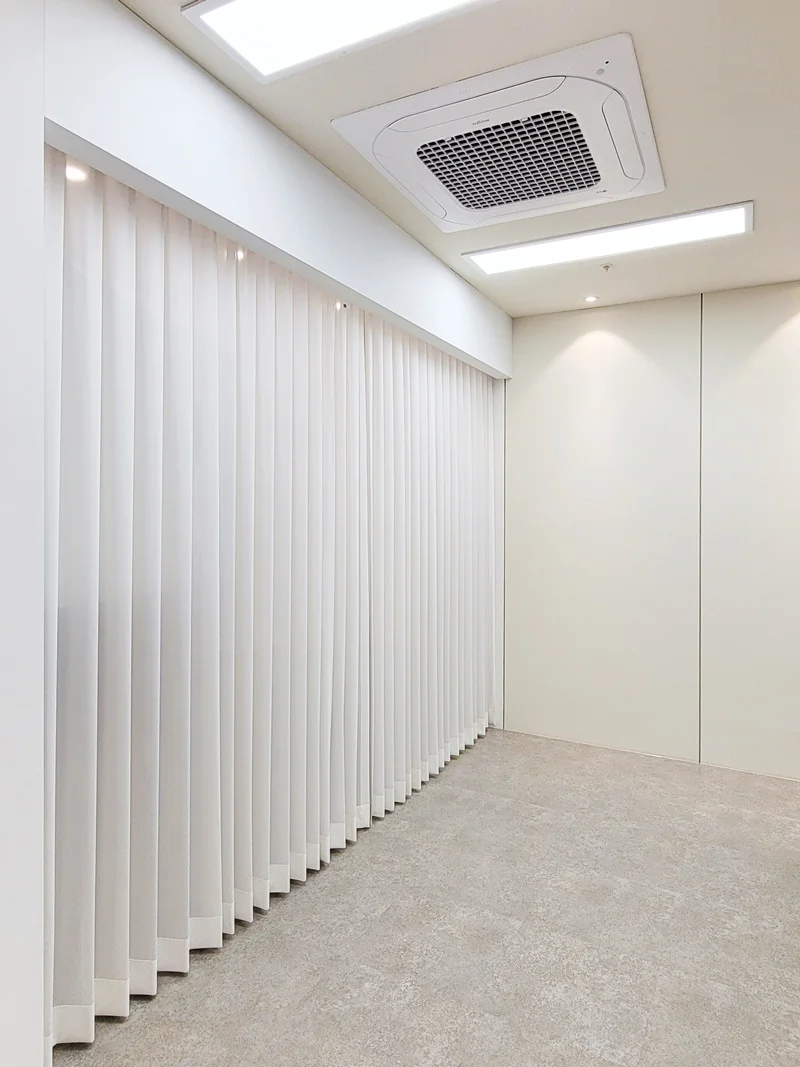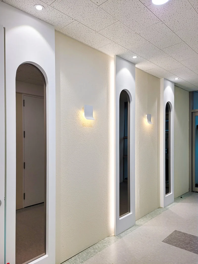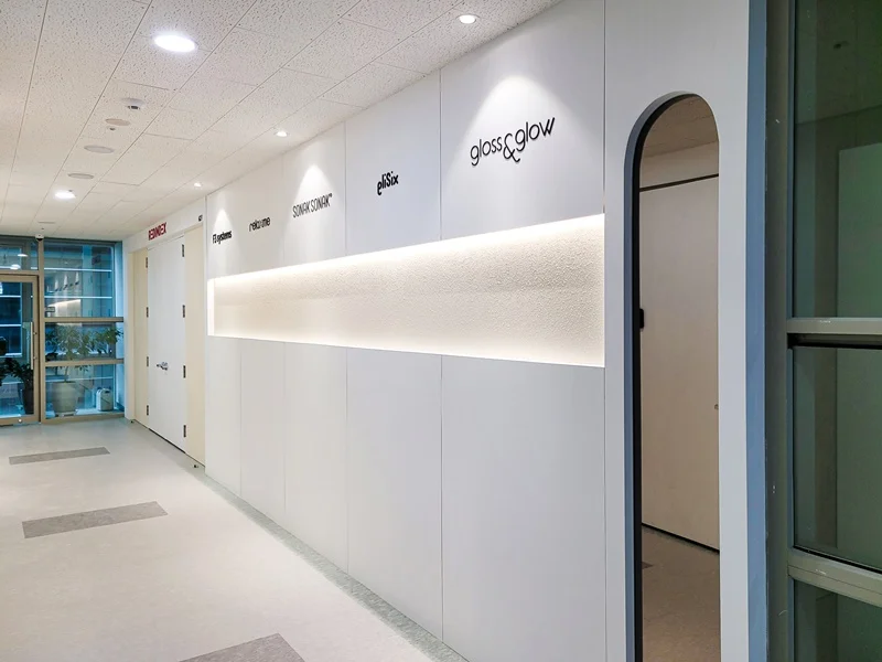 화이트 톤 벽면은 무광 도장 마감으로 고급스러우면서도 깔끔한 분위기를 전달하며, 조명은 간접 매립 방식으로 시공되어 눈부심 없이 은은한 빛으로 방문객을 맞이합니다.