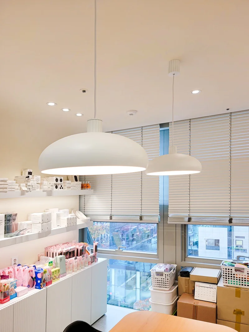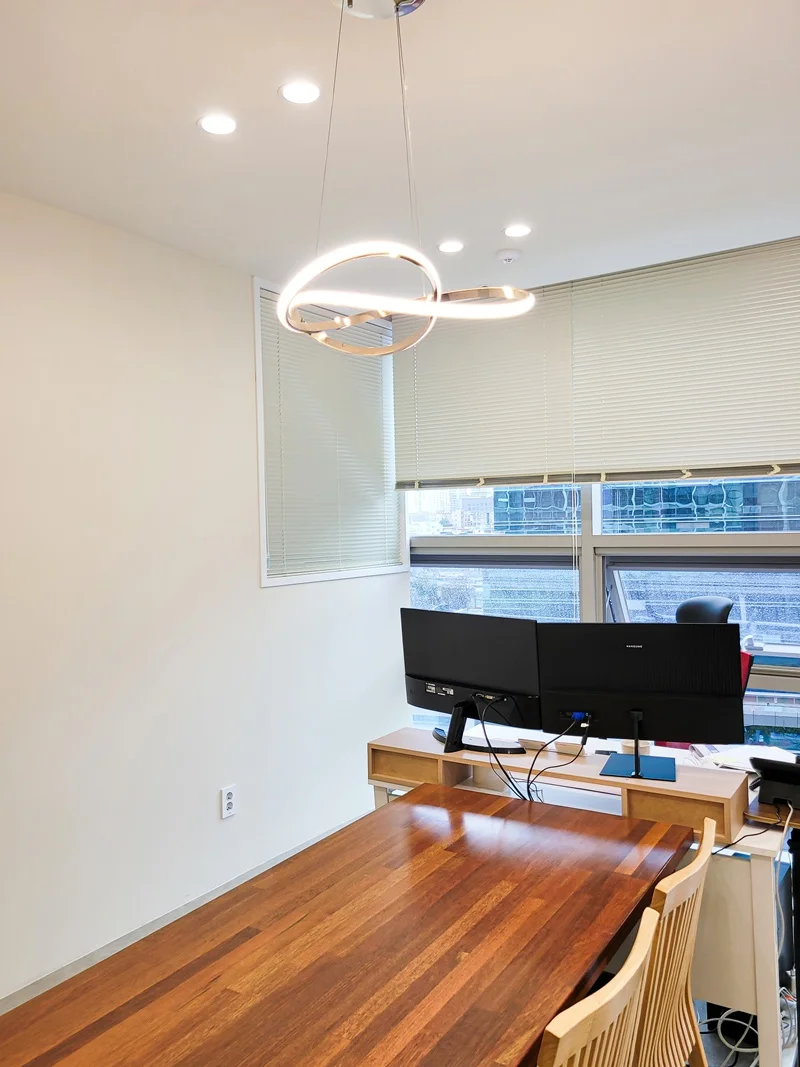 조명은 이번 시공에서 공간 분위기를 좌우하는 핵심 요소였습니다. 라인 조명, 매입 간접조명, 펜던트 조명 등 조명 종류가 다양하고 위치가 복잡했기 때문에, 목공 작업 직후 전기 배선 작업을 정밀하게 진행하였습니다.
