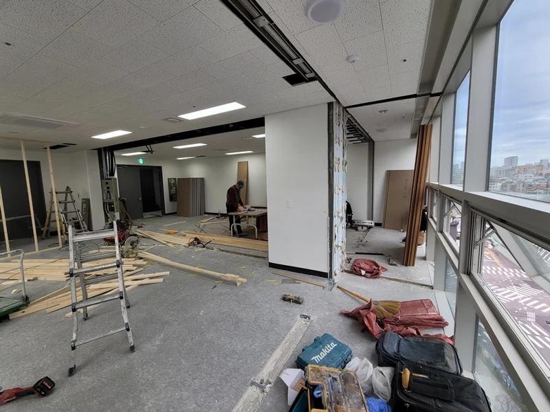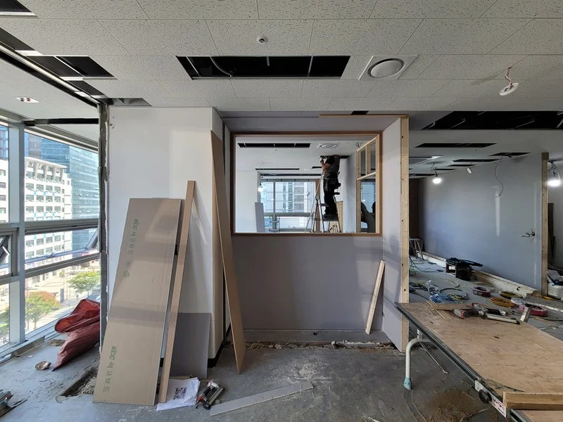 공사는 정확한 실측에서 시작됩니다. 이번 관악구인테리어업체 사무실 프로젝트는 소형 평수의 공간인 만큼, 최대한 벽체를 줄이고 오픈형 구조로 구성하면서도, 대표실·휴게공간·아트월·카페테리아 등 필수 기능을 분리할 수 있도록 레이아웃을 정교하게 계획하였습니다.