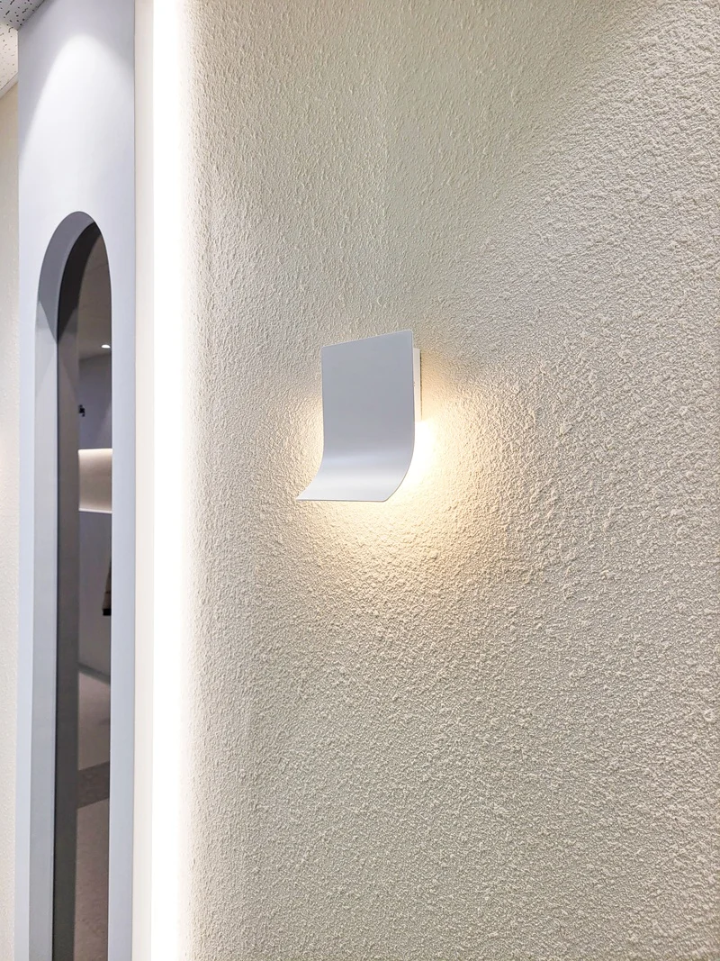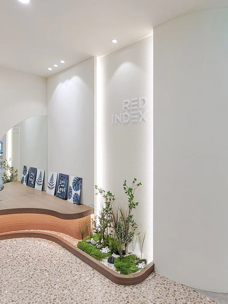 입구를 지나면 마주하게 되는 아트월 공간은 작은 공간이지만 강한 인상을 줄 수 있도록 곡선형 벽면 디자인을 적용했습니다. 부드러운 곡선 구조를 따라 간접 조명을 벽면 하부에 은은하게 매립하고, 그 아래에는 플랜테리아 공간을 조성해 식물과 조명의 조화로운 조형미를 더했습니다.
