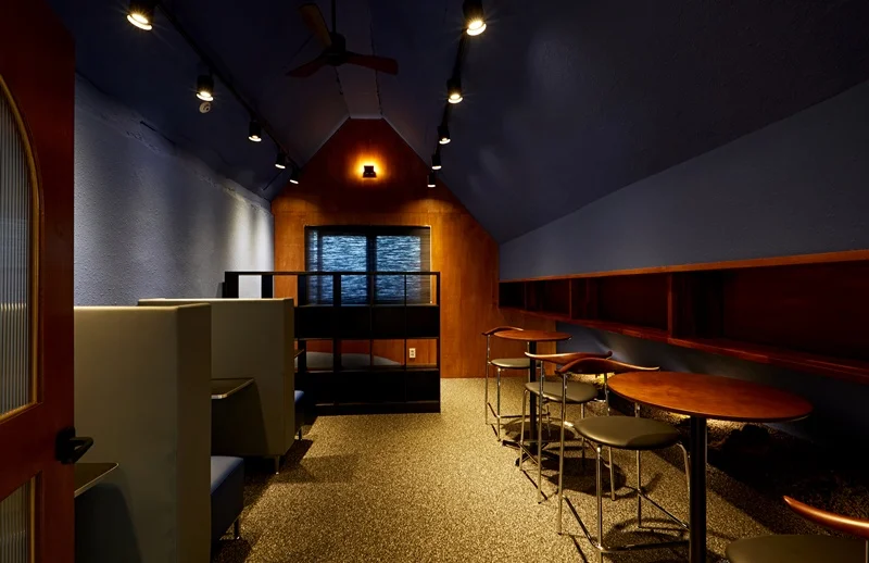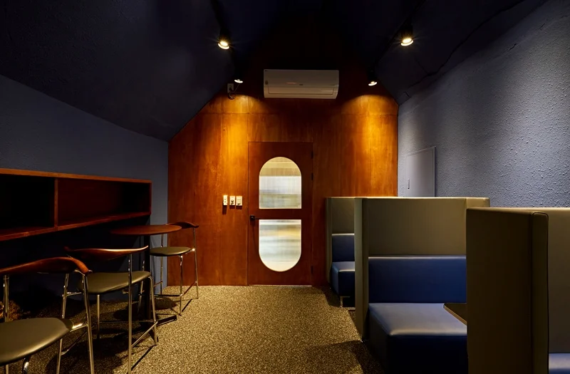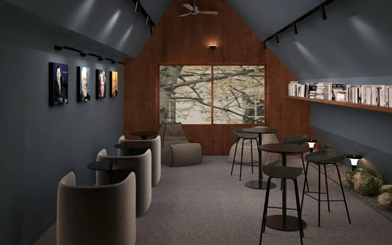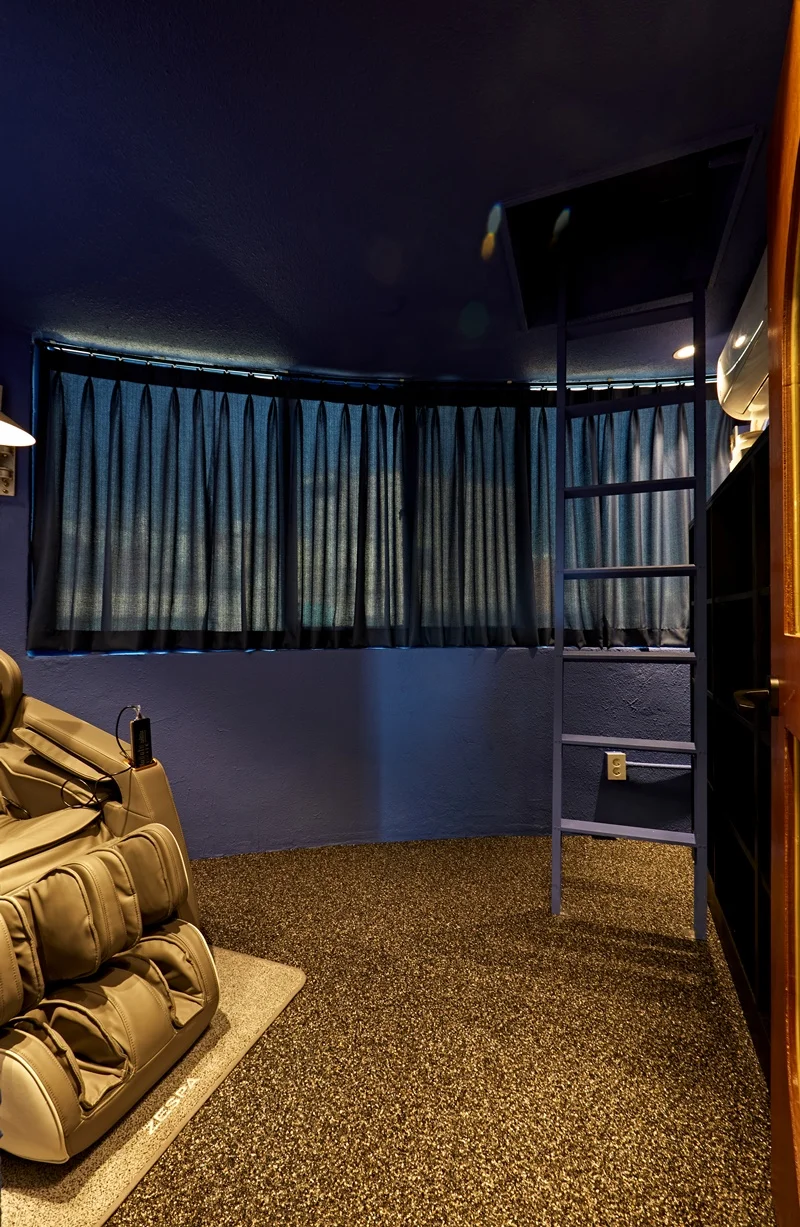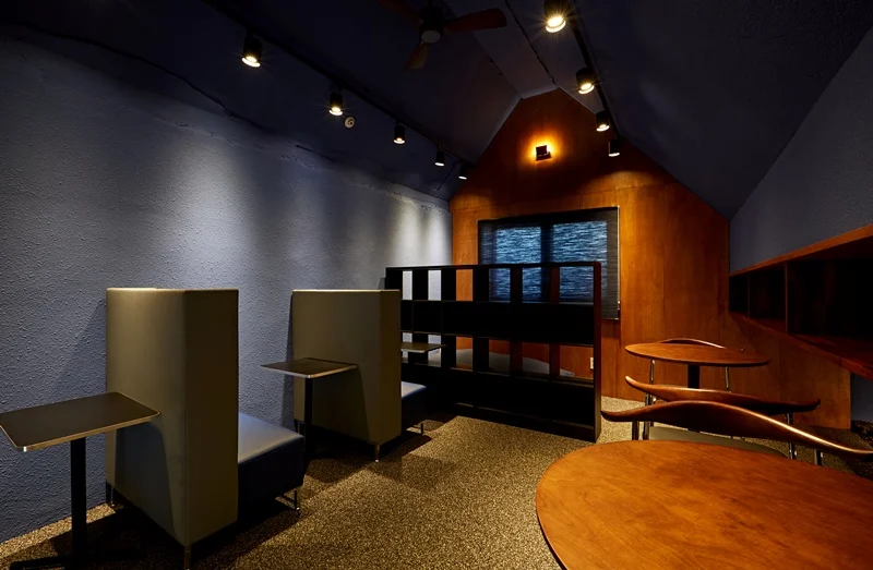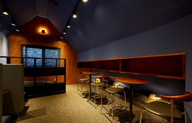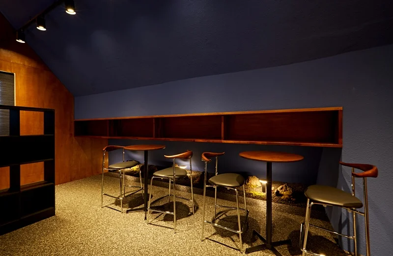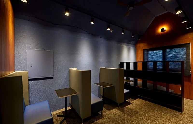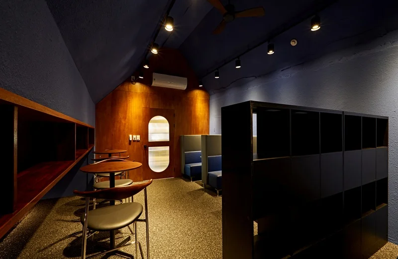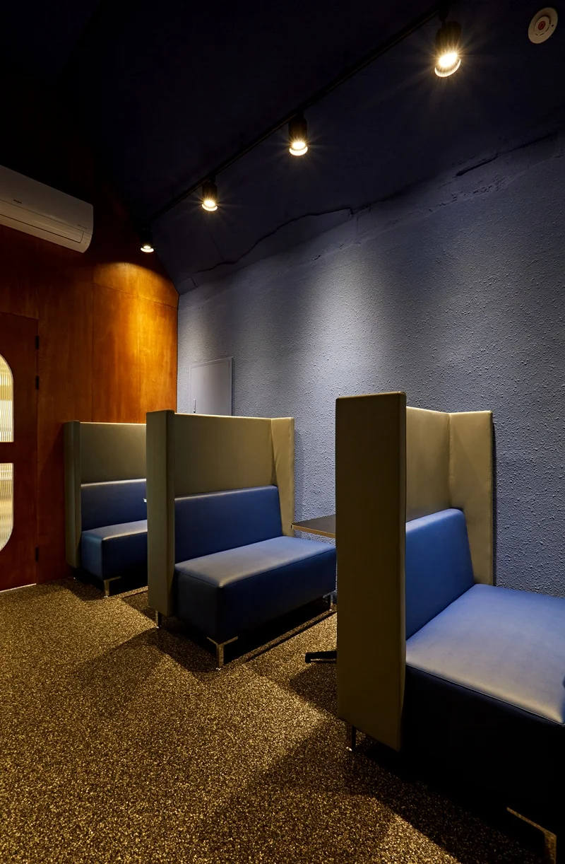 벽면은 짙은 네이비 색상으로 처리하여 안정적이고 집중할 수 있는 분위기를 만들었고, 우드 소재의 선반과 테이블을 배치해 따뜻함을 더했습니다. 이 공간의 조명은 주로 온화한 간접 조명과 포인트 스팟 조명을 사용하여 특유의 차분함과 아늑함을 강조했습니다.