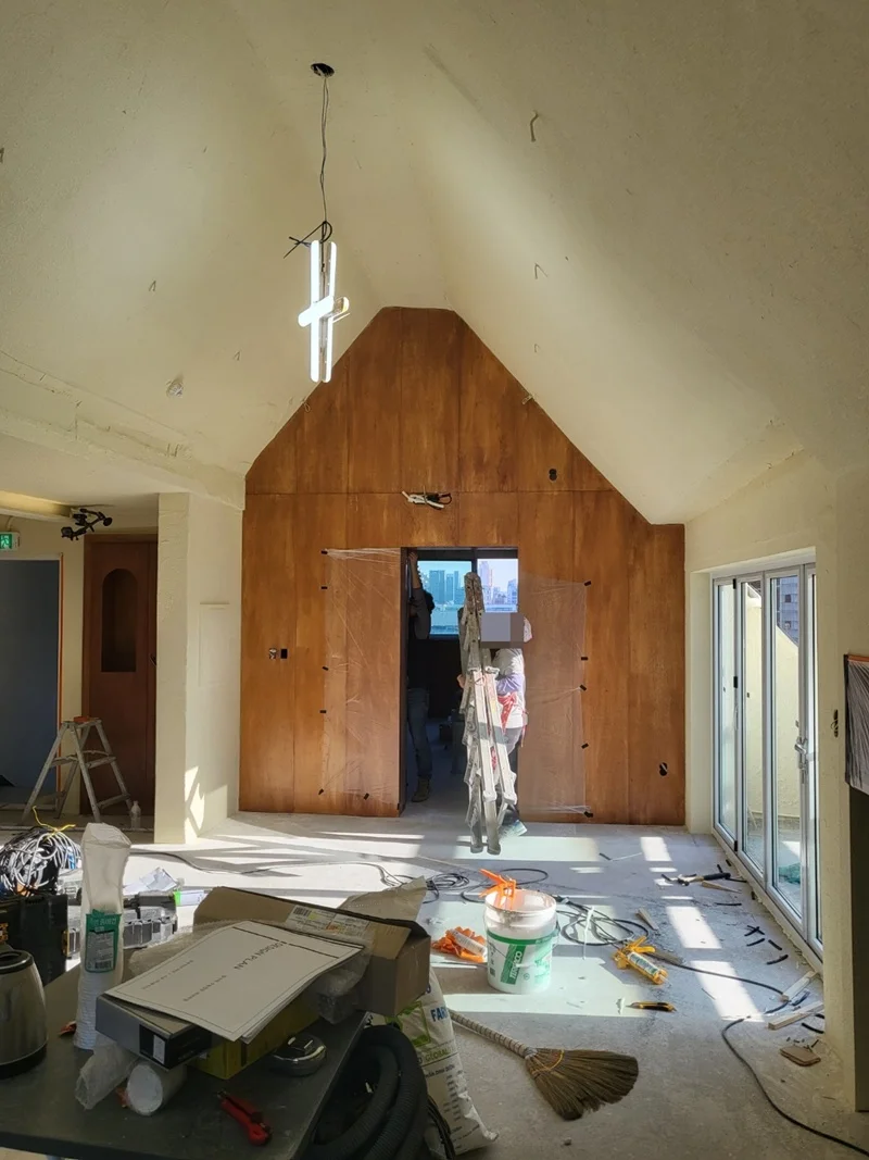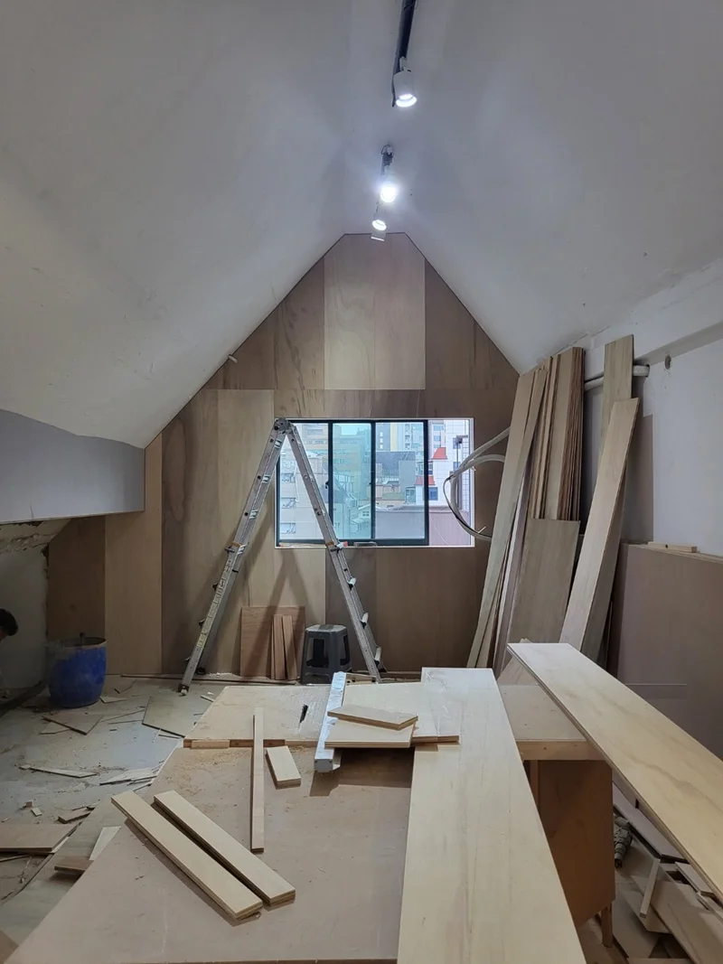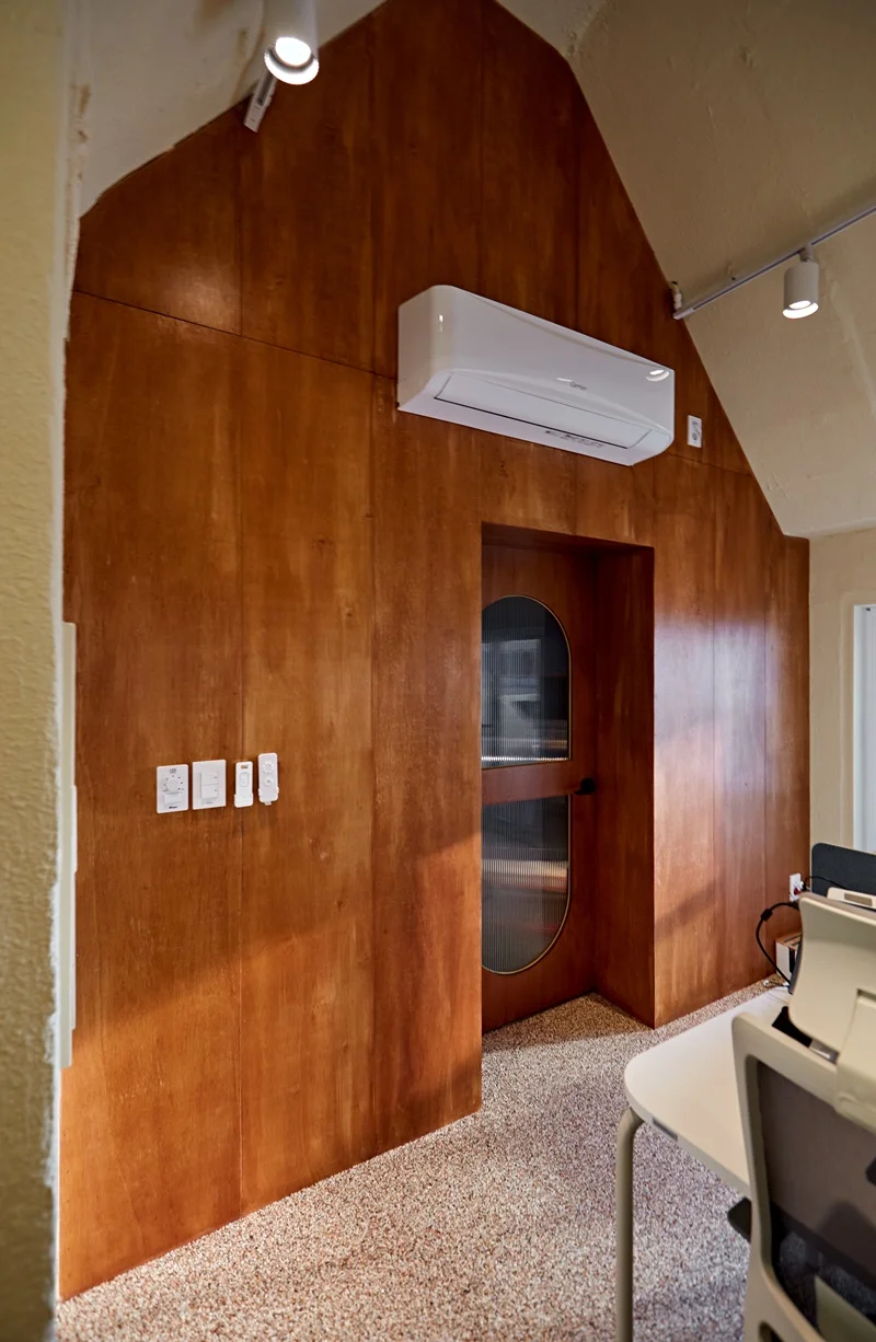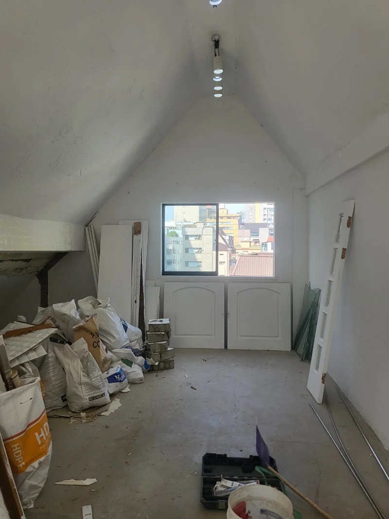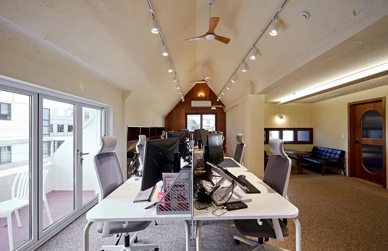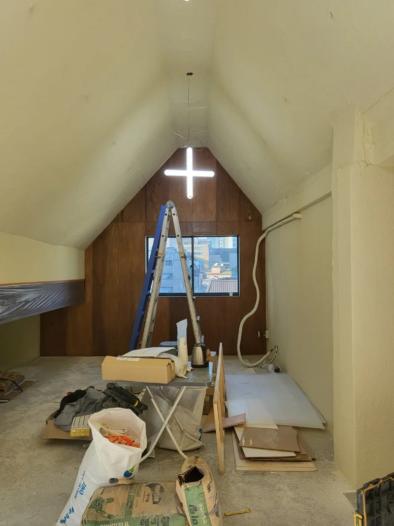 천장 구조가 복잡하고, 오픈형 사무공간과 휴게공간의 조명을 세밀하게 조정할 필요가 있어 전기 배선과 조명 설치는 초반 단계에서 진행했습니다. 삼각형 천장 레인 조명을 설치하고, 휴게공간과 베란다에는 간접조명과 스팟 조명을 배치했습니다. 이 과정에서 조도 측정과 전기 안전 점검도 동시에 진행되었습니다.