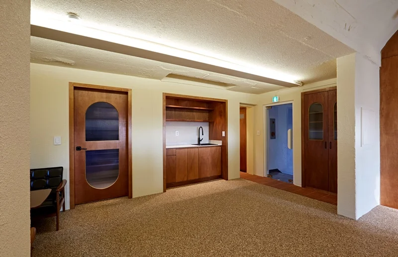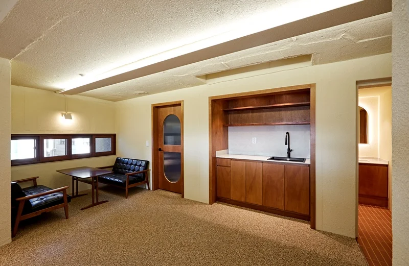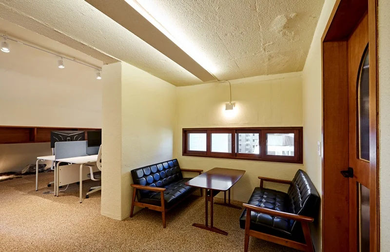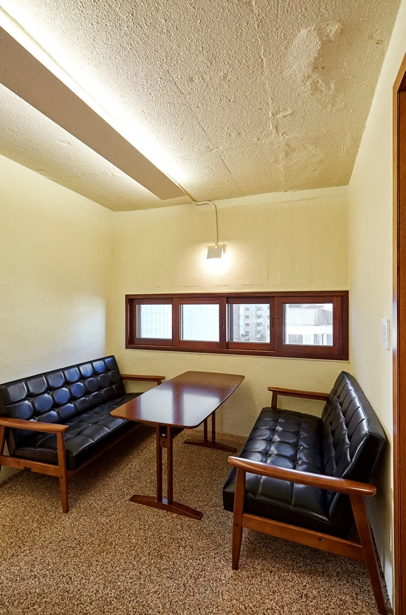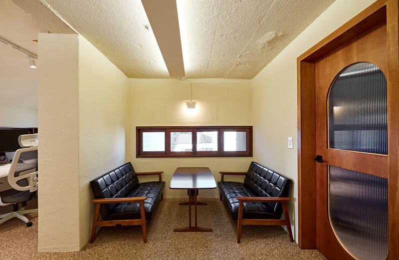 사무실에 들어서면 가장 먼저 눈에 들어오는 공간은 입구 벽면을 활용한 상담 및 휴게 공간입니다. 벽면과 가벽 공간을 활용하여 마주보는 소파와 테이블을 배치했으며, 방문객이나 직원들이 잠시 앉아 대화하거나 휴식을 취할 수 있는 공간으로 연출했습니다. 이 공간의 핵심 포인트는 편안함과 아늑함입니다. 소파는 부드러운 원목 프레임과 블랙 톤의 쿠션을 사용하여 공간의 포근한 분위기를 강조했으며, 테이블 또한 우드 소재를 활용해 자연스러운 질감을 살렸습니다.