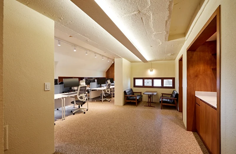 이 공간의 특징은 깔끔한 우드 톤과 아이보리톤 배경의 조화입니다. 우드 질감의 벽면 포인트 요소와 바닥 마감재가 어우러져 편안하고 안정적인 업무 환경을 제공합니다. 또한 파티션 높이를 적절히 조절하여 시야가 막히지 않고 개방적인 느낌을 살리는 동시에, 업무 집중을 위한 공간 분리를 실현했습니다. 조명은 주로 직접 조명과 간접 조명을 조합하여 눈부심을 최소화하고, 장시간 근무에도 피로감을 줄일 수 있도록 배치했습니다.