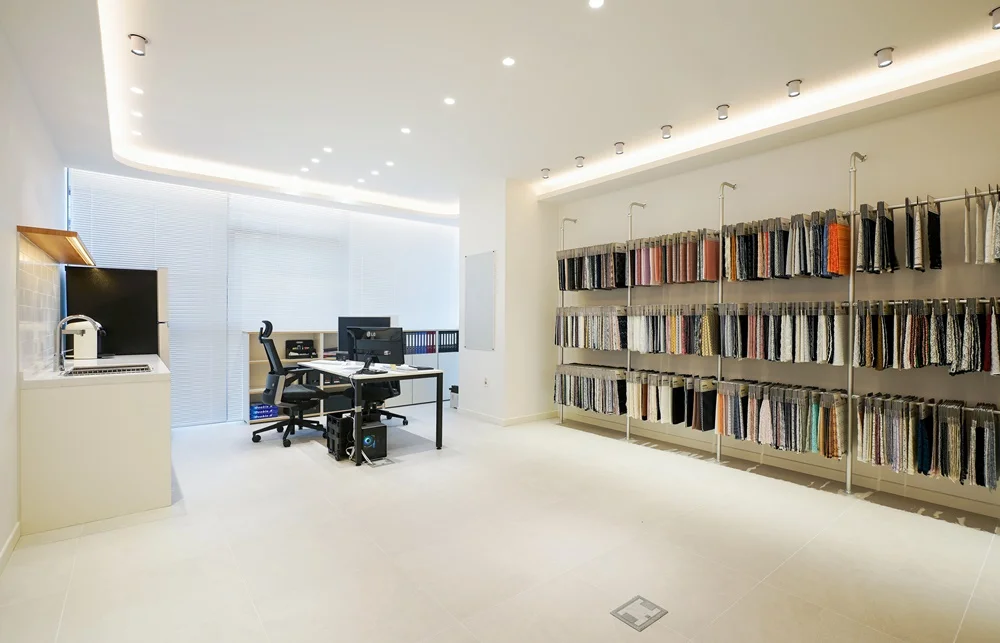 무엇보다도 벽면의 원단 샘플 디스플레이는 디자인 사무실로서의 전문성과 감각을 보여주는 인테리어 포인트로서, 다양한 질감과 색상들이 공간에 생기를 더해주며 방문객이나 직원에게도 영감을 주는 요소가 됩니다.