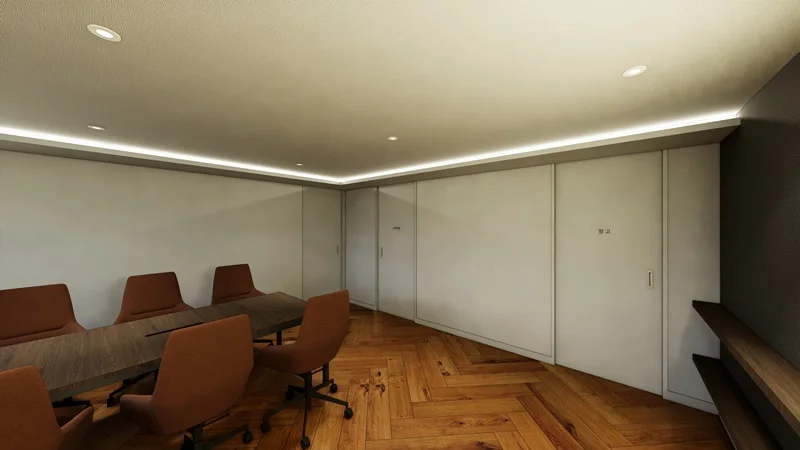 대표실의 전반적인 배치는 실용성과 디자인을 동시에 고려한 결과로, 업무에 집중할 수 있는 조용한 분위기와 대외적 신뢰감을 모두 전달할 수 있는 공간으로 완성되었습니다.