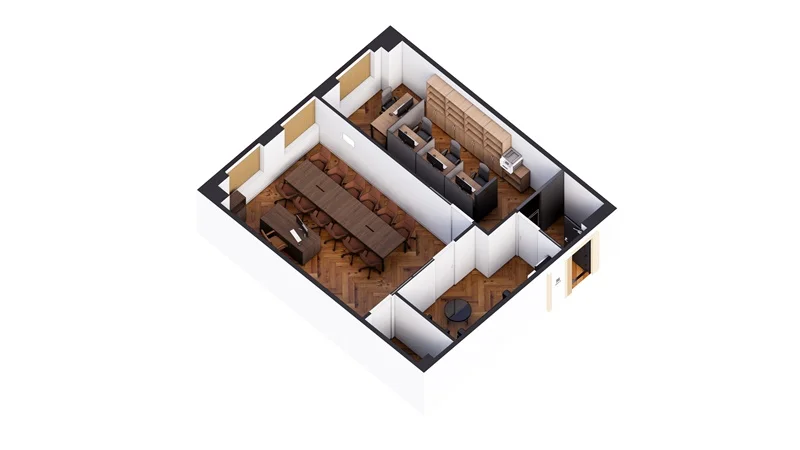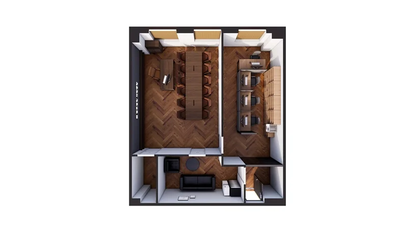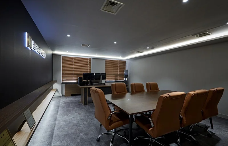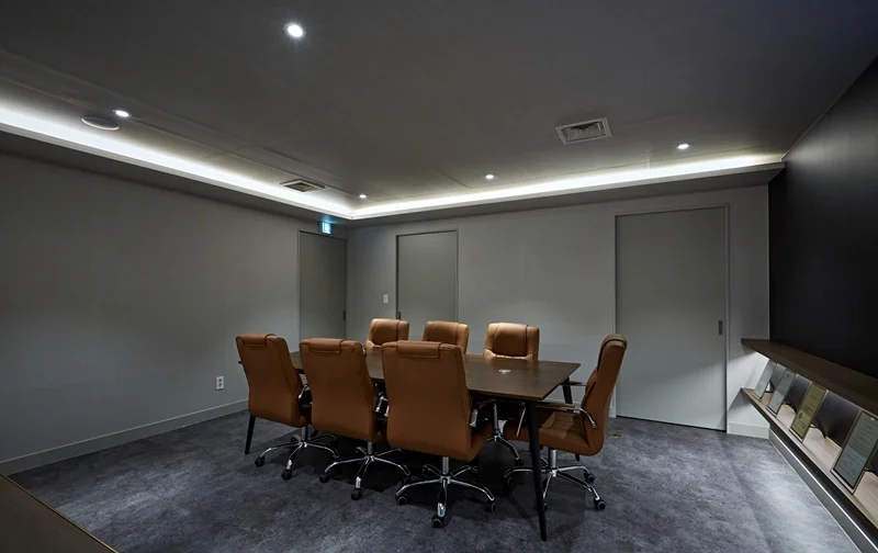 가구 구성은 따뜻한 대비를 주기 위해 우드 컬러의 대형 데스크와 회의 테이블을 배치했습니다. 이로 인해 블랙과 그레이로 구성된 공간 속에서 자연 소재의 따뜻함이 느껴지도록 하여, 고객 응대 시에도 무게감과 편안함이 균형을 이루게 했습니다.