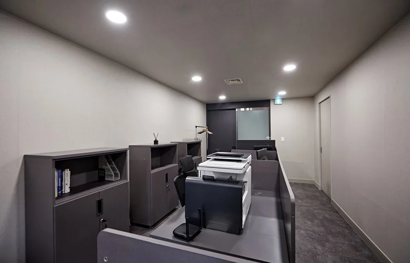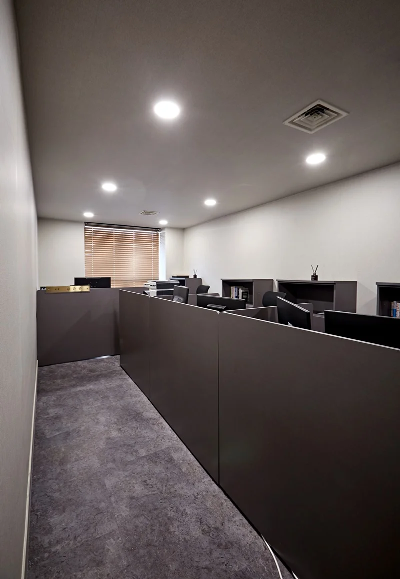 바닥은 중간 톤의 그레이 바닥재를 시공하여 전체 공간에 차분한 인상을 주고, 각 데스크는 딥 그레이~블랙 계열의 책상으로 무게감을 더했습니다. 이는 법무법인의 진중함과 신뢰성을 시각적으로 표현한 의도적 디자인이었고, 구성원 간의 업무 몰입도를 높이기 위한 환경 연출이었습니다.