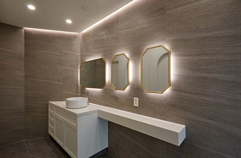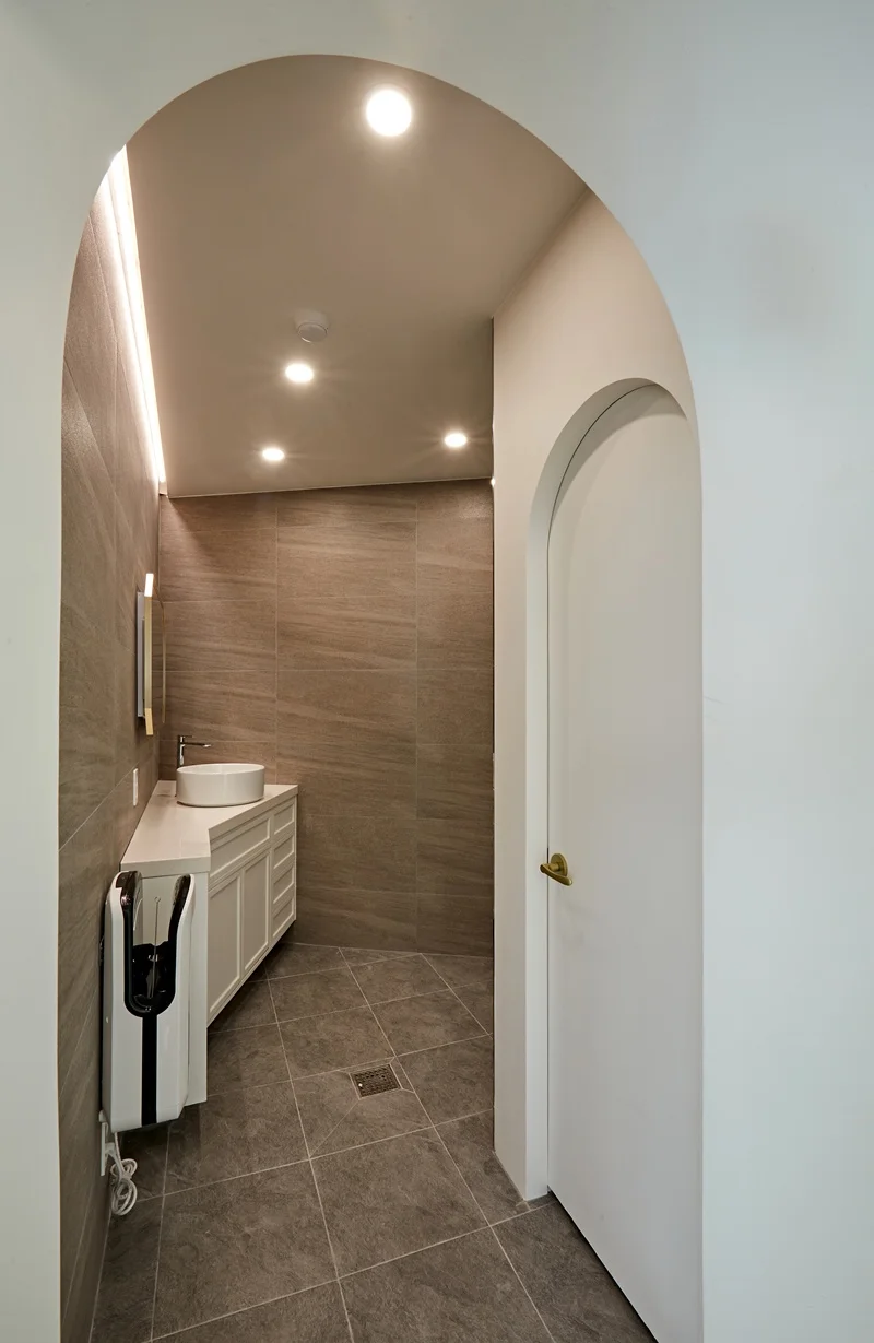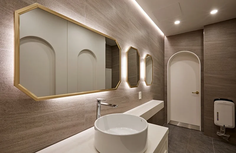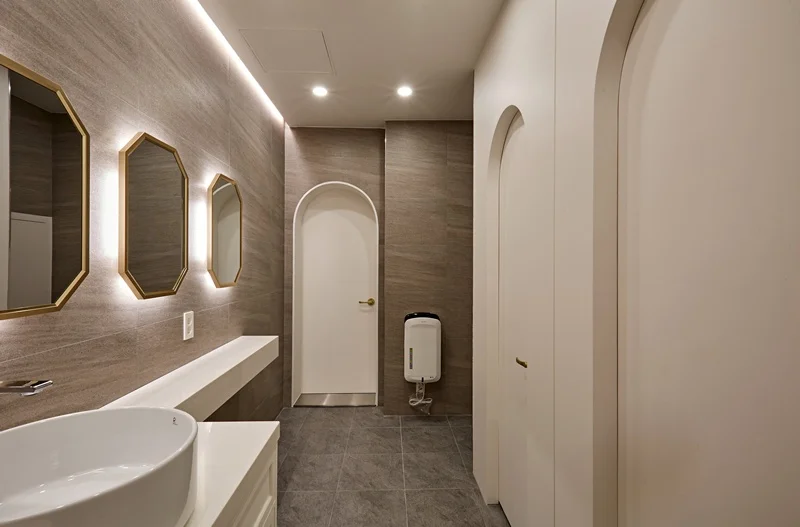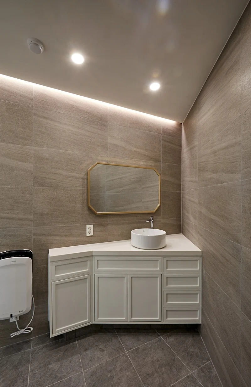 세면대는 인트 거울 세면대를 설치해 고급스러운 이미지를 높였고, 거울 주변에는 간접 조명과 포인트 LED를 배치하여 공간의 품격을 한층 끌어올렸습니다. 세면 부스와 변기 등 위생설비는 최신 제품으로 교체해 위생과 디자인을 동시에 만족시켰습니다.