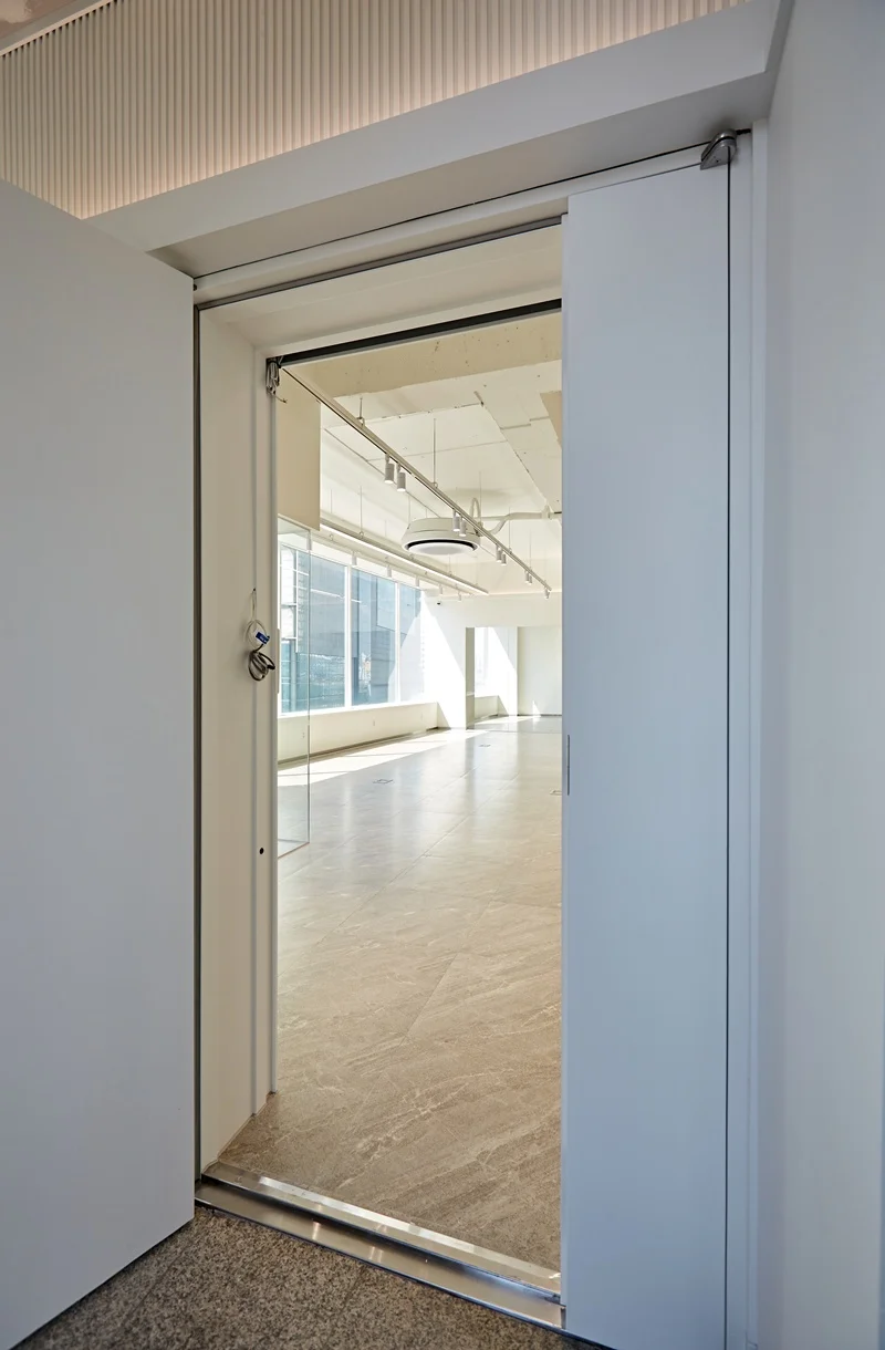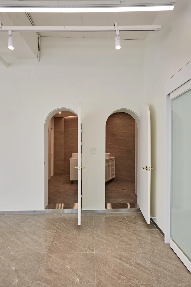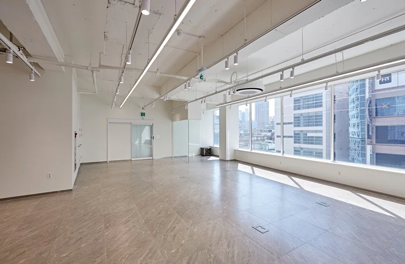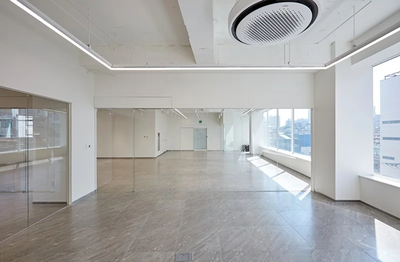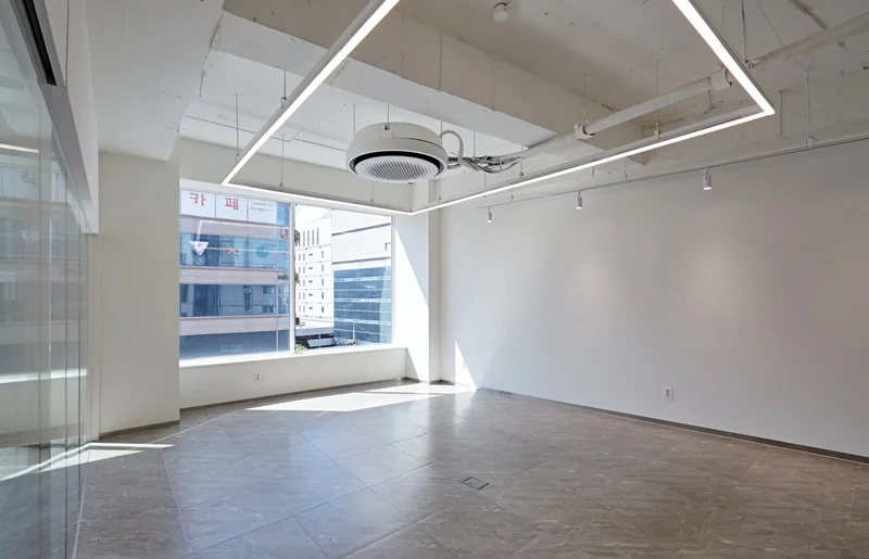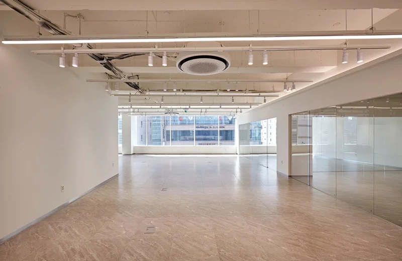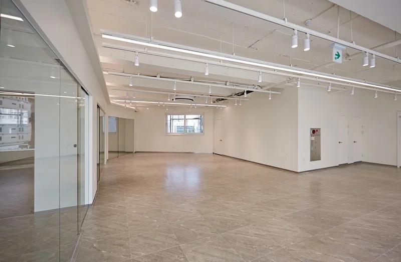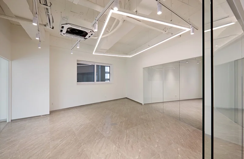 바닥은 옅은 베이지톤을 적용해 통일감을 주었으며, 벽면은 깨끗한 화이트 톤으로 마감하여 자연광과 조명을 최대로 활용할 수 있게 했습니다. 노출형 천장과 조명의 배치를 통해 공간이 시각적으로 넓어 보이는 효과를 구현했으며, 천장에 설치한 간접 LED 조명은 업무 집중도를 높이면서도 눈의 피로를 최소화하도록 설계했습니다.