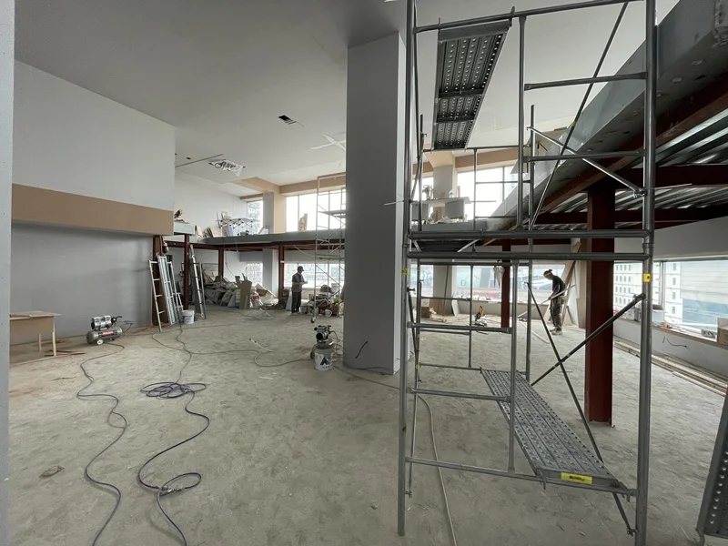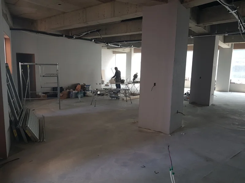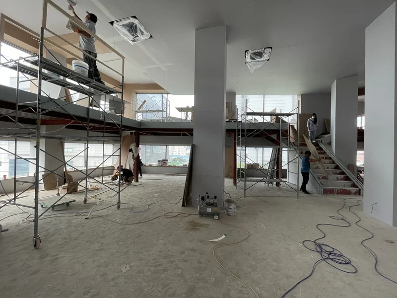 철거가 완료된 후, 공간별 목공 공정을 진행했습니다. 오픈형 사무공간과 회의실, 대표실을 구획할 유리가벽과 프레임 가벽 설치가 핵심이었습니다. 가벽 설치 시 정확한 수평과 높이를 맞추어 시공하였고, 복층 공사를 위한 기초 작업도 진행하였습니다.