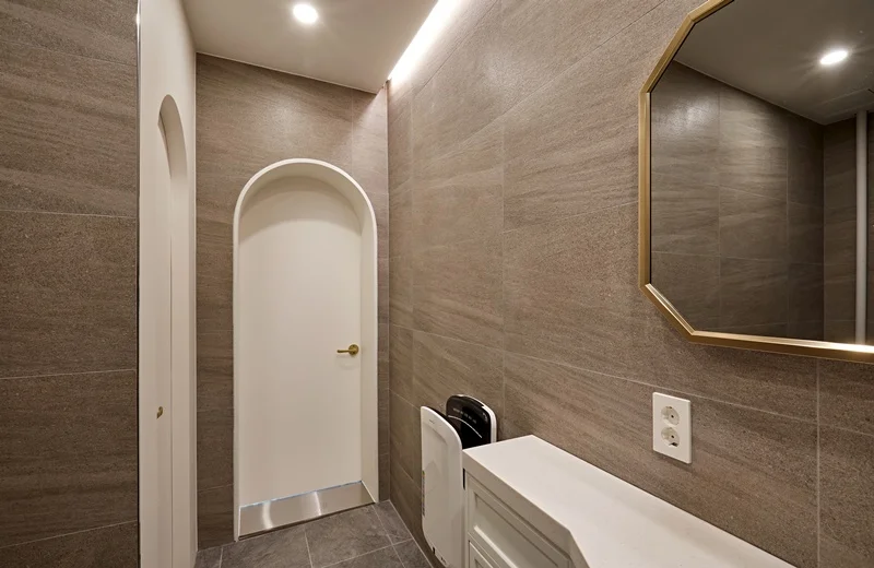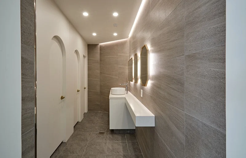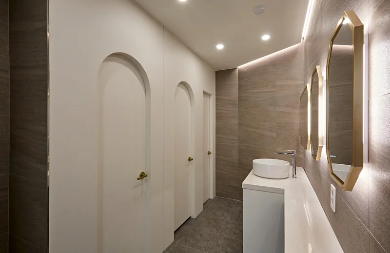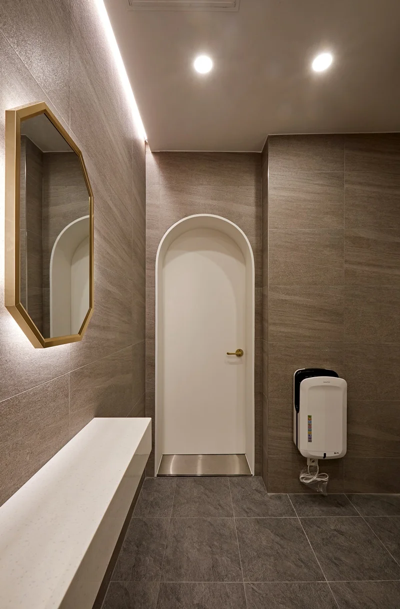 이번 동탄인테리어업체 사무실 구조 전체 리모델링에서는 화장실 공간 역시 고급스럽게 설계했습니다. 바닥은 세라믹 타일로 마감하여 내구성과 청결성을 높였으며, 벽면은 고급스러운 모노톤 타일과 일부 골드 포인트로 세련된 느낌을 살렸습니다.