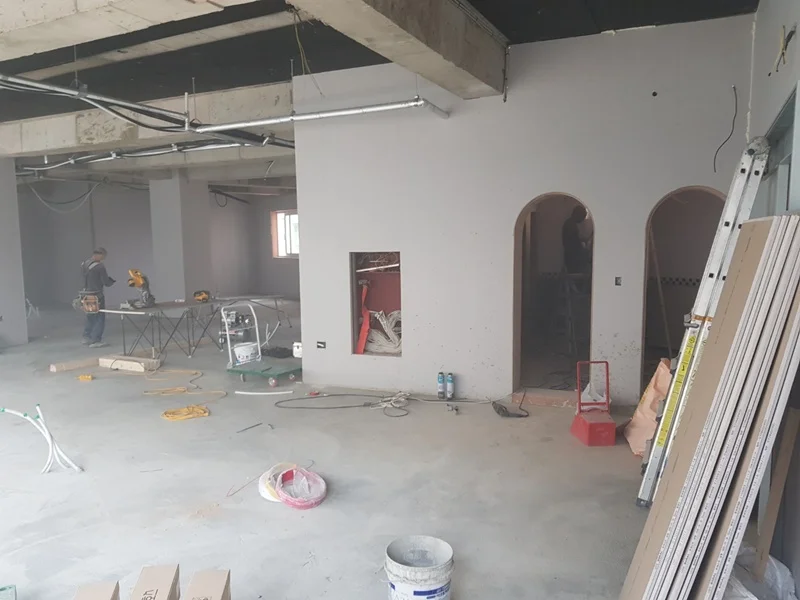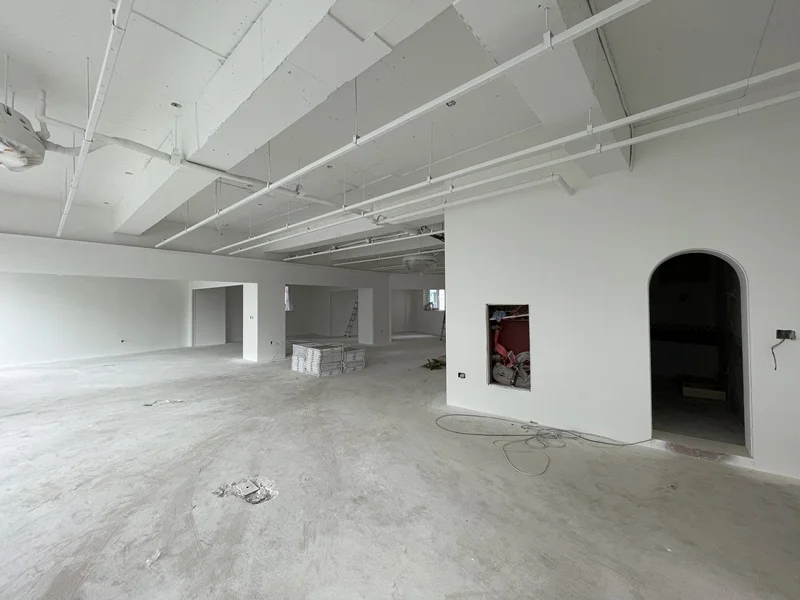 목공 공정이 완료된 후, 벽면과 천장의 마감 작업이 진행되었습니다. 전체 벽면은 화이트 톤 페인트로 도장하여 공간이 더욱 밝고 넓어 보이도록 했습니다. 천장은 기존 노출형 구조를 활용하되, 배관과 조명 트랙을 노출하여 모던하고 세련된 분위기를 완성했습니다.