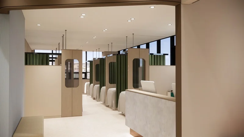 프라이버시 확보를 위해서는 독립적인 치료 공간을 마련하는 것이 가장 좋습니다. 각각의 치료 공간은 커튼이나 블라인드를 이용하여 구분할 수 있으며, 내부에는 개인 물품을 보관할 수 있는 수납공간과 거울 등을 설치하여 편의성을 높일 수 있습니다.