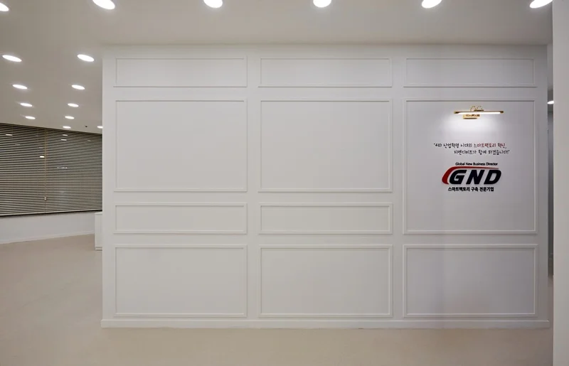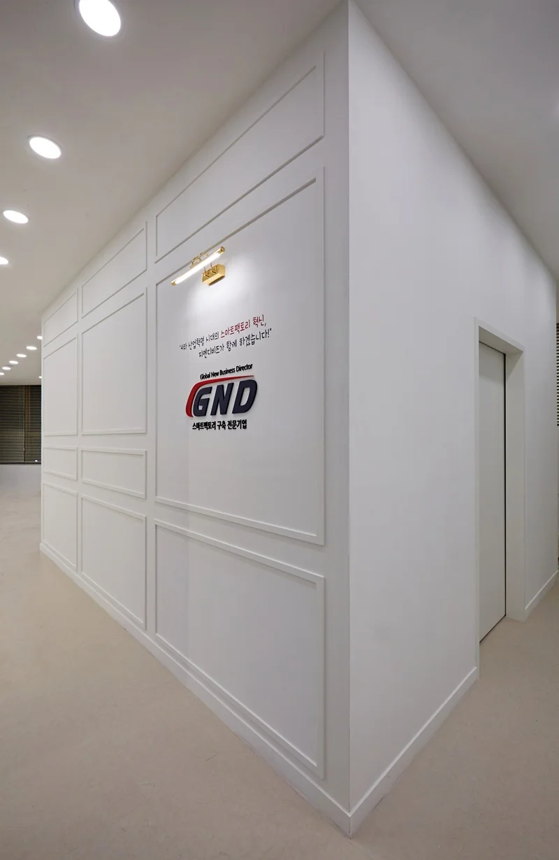 이번 인테리어에서는 단조로운 화이트 벽면 대신, 입체감이 살아있는 패턴형 월판넬을 사용해 세련된 분위기를 연출했습니다. 그 위에는 기업의 브랜드 로고를 채널사인 형태로 제작하여 부착하고, 주변에는 간접조명을 넣어 로고가 더욱 돋보이도록 설계했습니다. 이 공간은 고객 및 방문객이 들어왔을 때 기업의 정체성을 가장 강하게 인지할 수 있는 포인트 공간으로, 최근 인테리어에서 특히 강조되는 부분 중 하나입니다.
