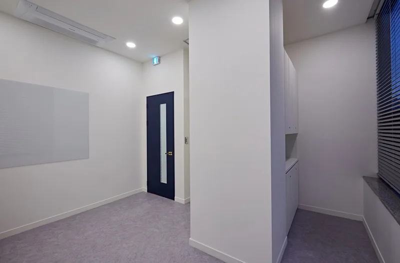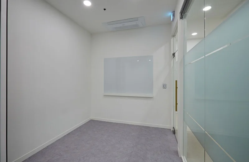 회의실 내부는 화이트 벽면으로 구성하고, 천장에는 고급스러운 매입 조명과 간접조명을 활용하여, 회의 집중도가 높아지도록 디자인했습니다. 또한 유리 벽면에는 반투명 시트지 시공으로 외부에서는 회의 상황이 바로 보이지 않도록 프라이버시를 확보하면서도, 답답하지 않은 개방형 회의실을 구현했습니다.