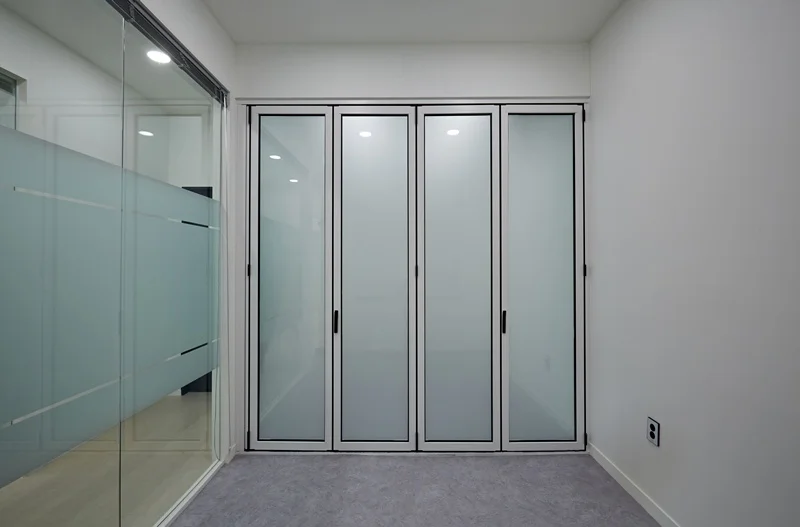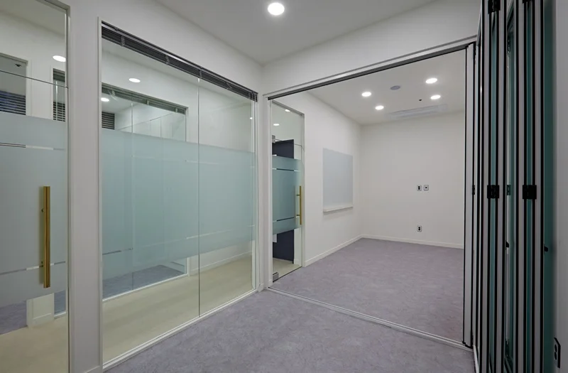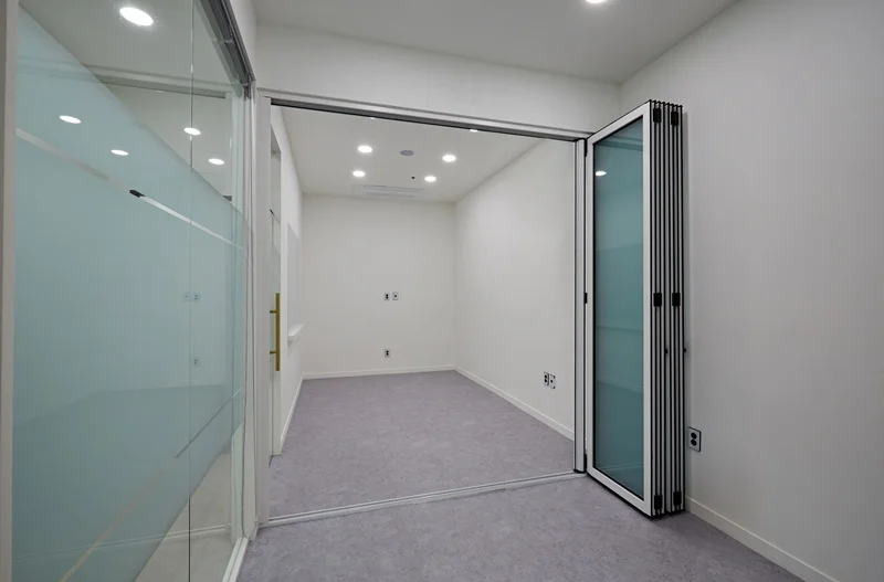 이번 인테리어에서 가장 주목할만한 공간은 바로 유리가벽 폴딩도어 회의실입니다.