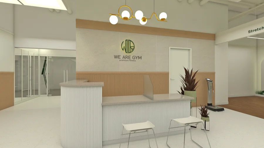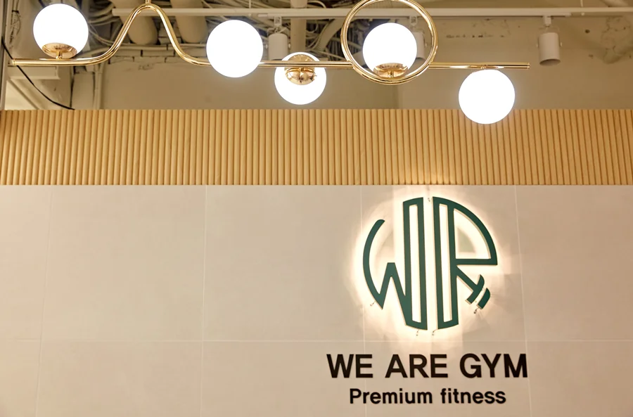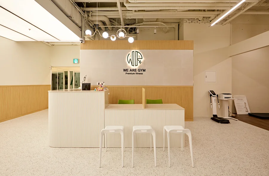 공간의 첫인상을 결정짓는 입구와 데스크는 포인트 아트월로 시선을 사로잡을 수 있게 디자인하였습니다. 데스크 뒤편 벽면에는 내추럴한 우드 패널을 활용한 아트월을 시공하고, 그 위에 헬스장의 상호명을 입체감 있게 제작하여 배치했습니다.