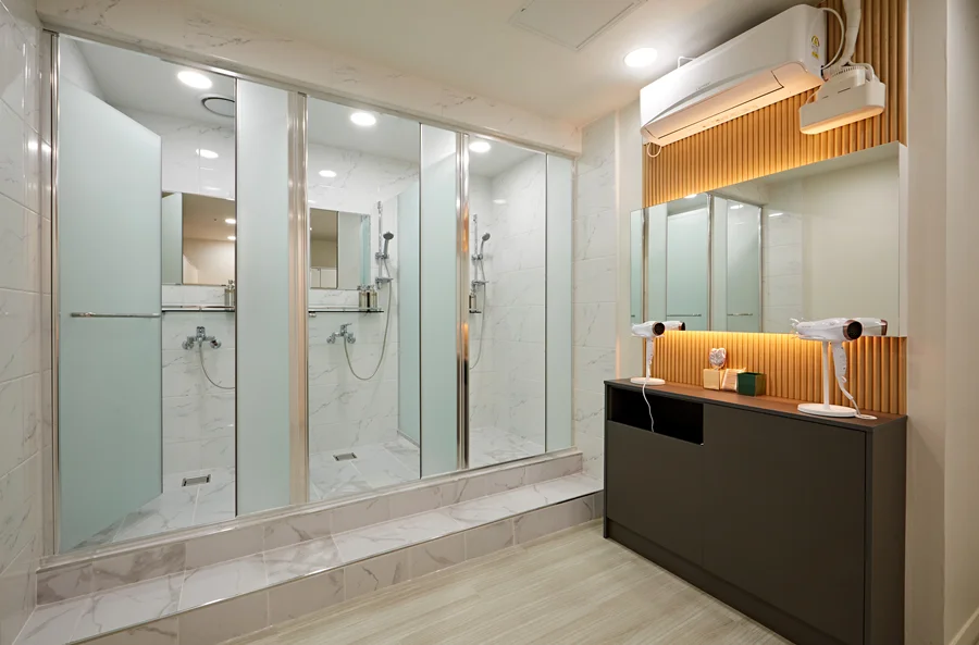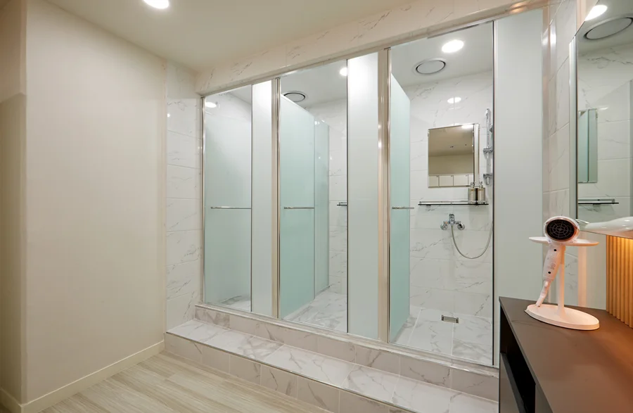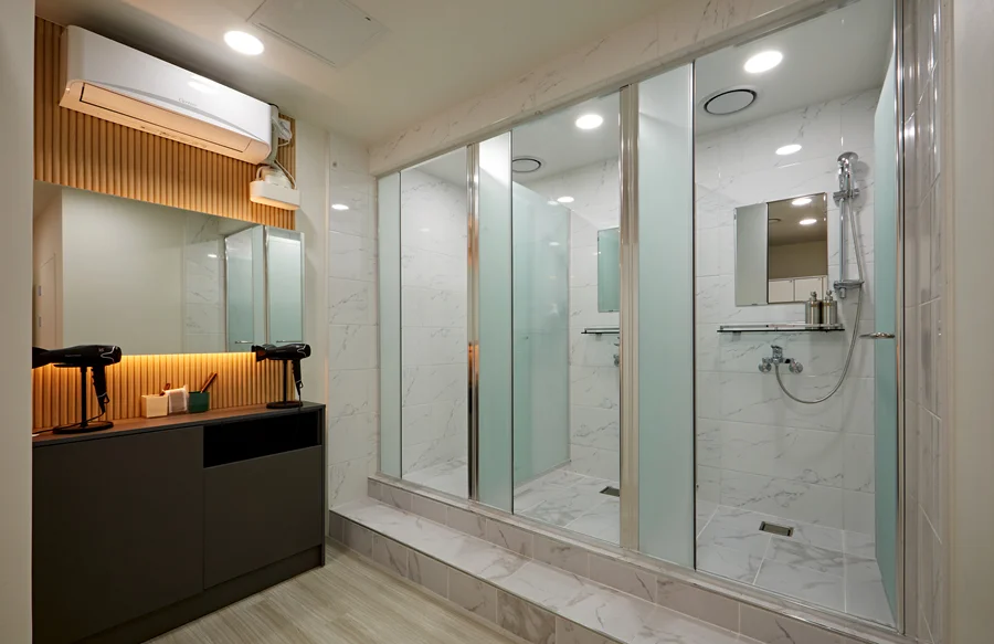 1인 샤워장은 개별 공간으로 구성하여 프라이버시를 보장하고, 내부는 미끄럼 방지 타일과 방수 마감으로 안전성과 청결을 모두 만족시켰습니다.