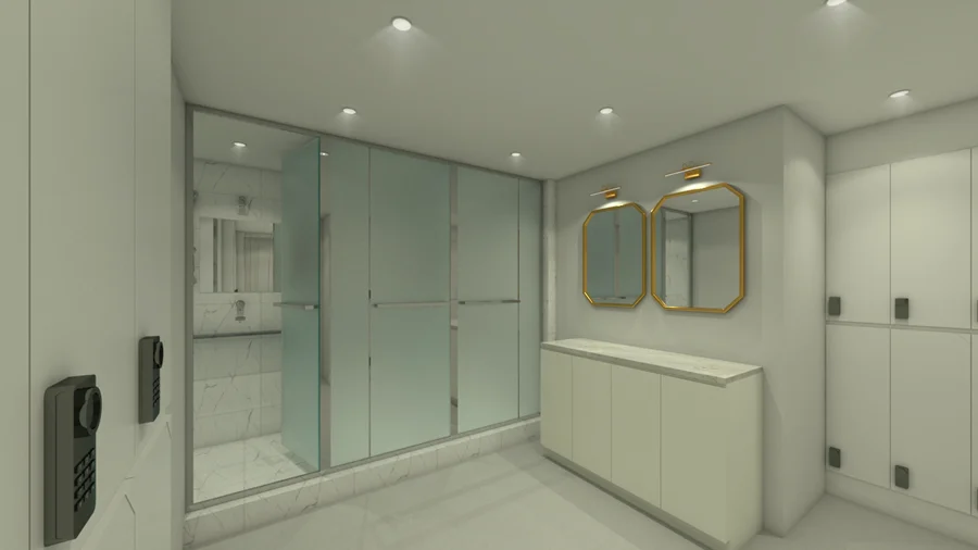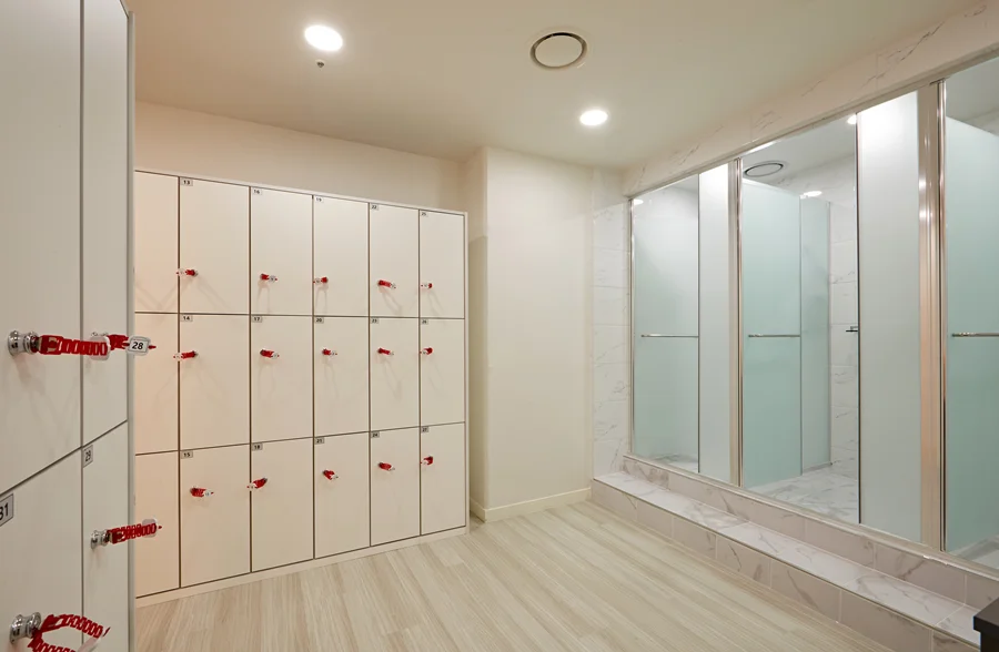 운동 후 편안한 마무리를 도와주는 탈의실과 샤워 공간은 넓고 깔끔하게 설계되었습니다. 탈의실은 개인 락커가 충분히 배치되어 있으며, 밝은 조명과 화이트 컬러로 위생적이고 쾌적한 인상을 줍니다.