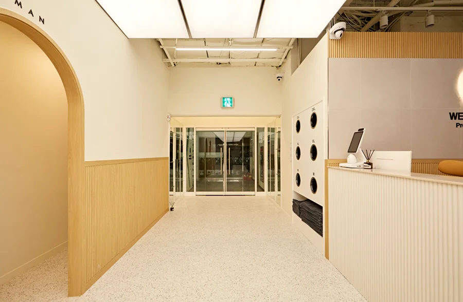 외부 파사드는 내부 콘셉트와 어우러지도록, 화이트 베이스에 우드 포인트로 마감해 통일감을 주었습니다. 입구에는 깔끔한 신발장을 설치해 내부 공간의 청결을 유지할 수 있도록 하고, 고객의 작은 불편함도 없도록 세심하게 배려한 설계가 돋보입니다.